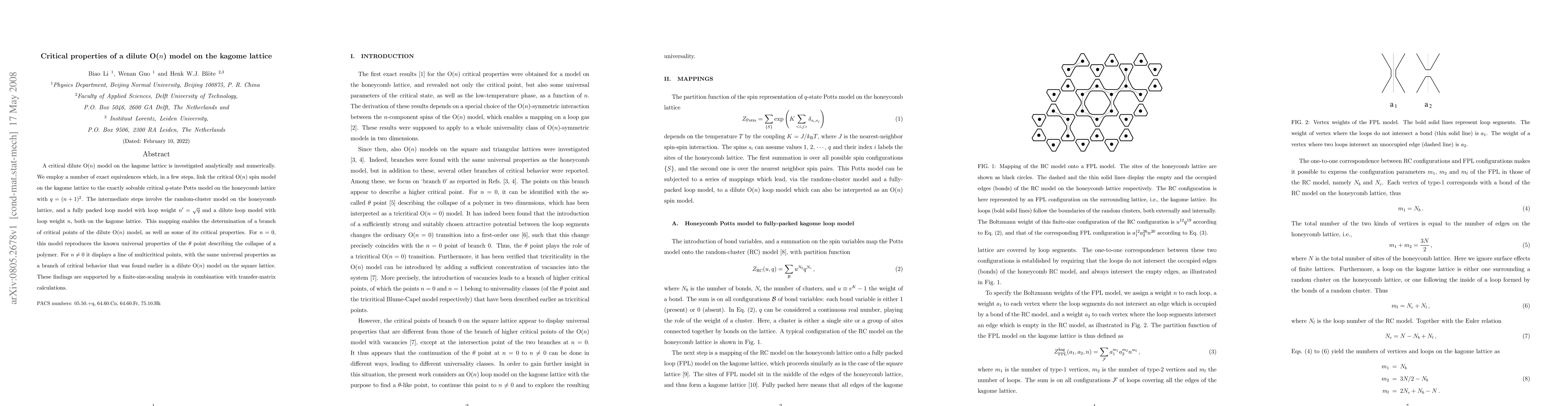 This paper investigates the critical properties of a dilute O($n$) model on the kagome lattice, establishing equivalences that link it to the solvable $q$-state Potts model on the honeycomb lattice. Critical points and properties are determined via mappings involving random-cluster and packed loop models, supported by numerical analysis.