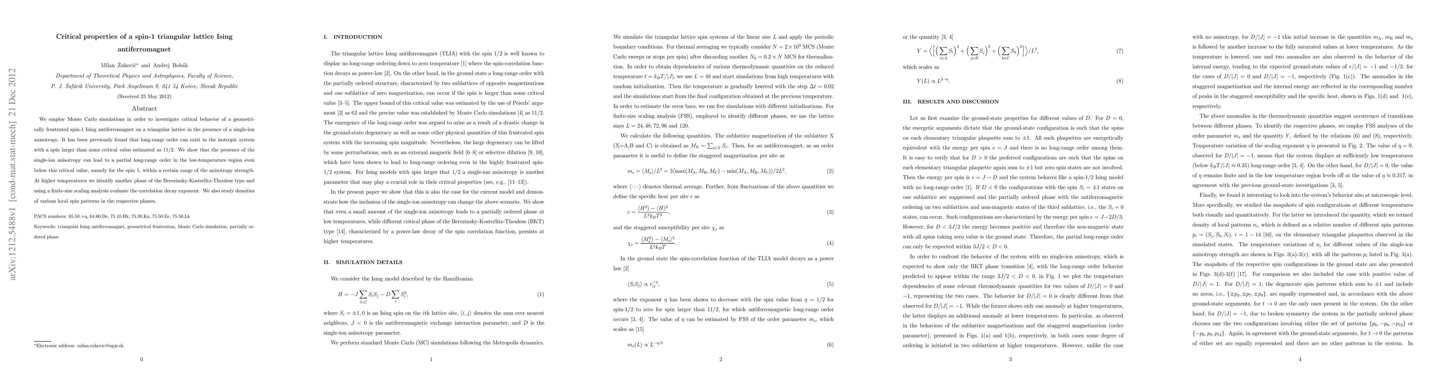 Monte Carlo simulations reveal critical behavior in a spin-1 triangular lattice Ising antiferromagnet, showing partial long-range order below a critical spin value due to single-ion anisotropy. At higher temperatures, a Berezinsky-Kosterlitz-Thouless phase emerges with evaluated correlation decay exponent.