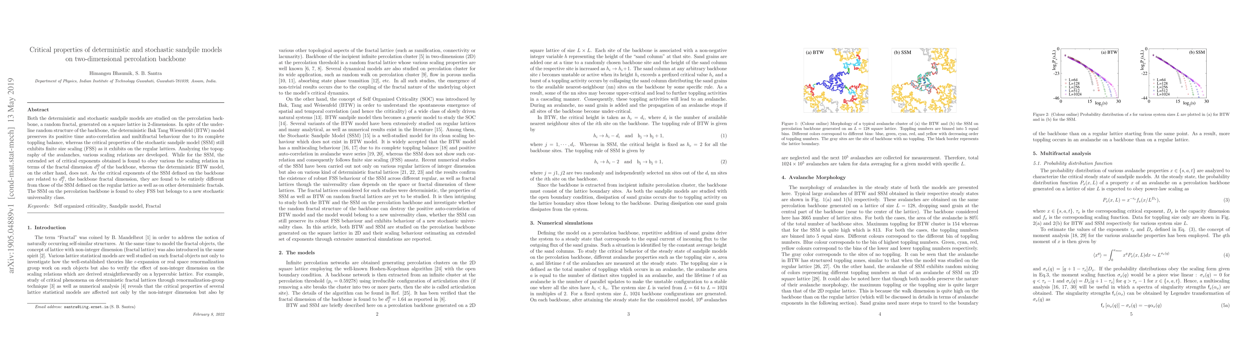 Both the deterministic and stochastic sandpile models are studied on the percolation backbone, a random fractal, generated on a square lattice in $2$-dimensions. In spite of the underline random structure of the backbone, the deterministic Bak Tang Wiesenfeld (BTW) model preserves its positive time auto-correlation and multifractal behaviour due to its complete toppling balance, whereas the critical properties of the stochastic sandpile model (SSM) still exhibits finite size scaling (FSS) as it exhibits on the regular lattices. Analysing the topography of the avalanches, various scaling relations are developed. While for the SSM, the extended set of critical exponents obtained is found to obey various the scaling relation in terms of the fractal dimension $d_f^B$ of the backbone, whereas the deterministic BTW model, on the other hand, does not. As the critical exponents of the SSM defined on the backbone are related to $d_f^B$, the backbone fractal dimension, they are found to be entirely different from those of the SSM defined on the regular lattice as well as on other deterministic fractals. The SSM on the percolation backbone is found to obey FSS but belongs to a new stochastic universality class.