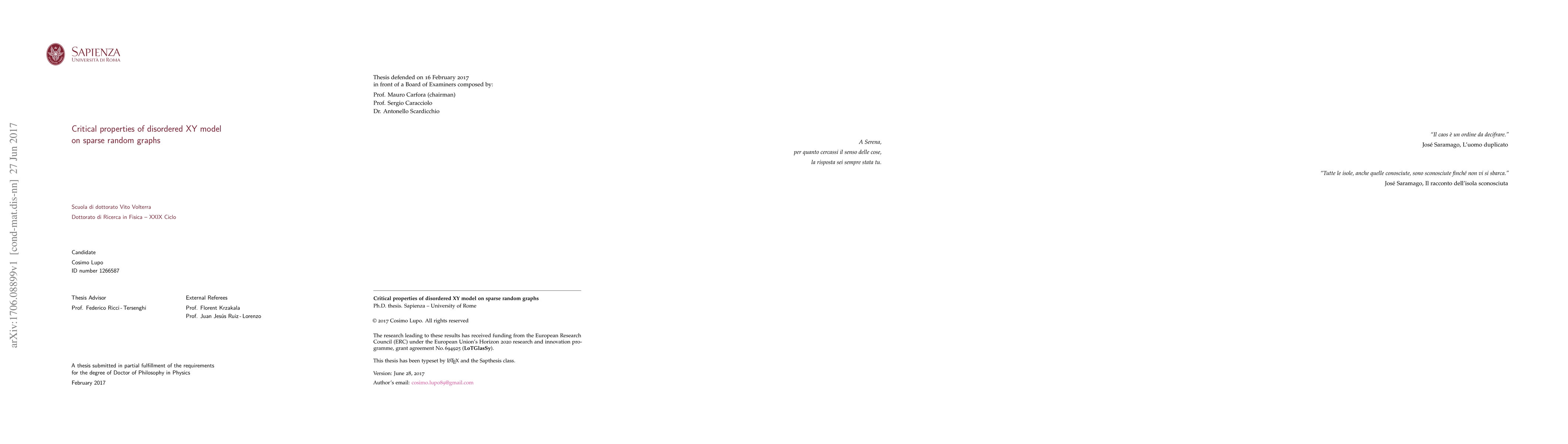 This research explores the critical properties of the XY model on sparse random graphs, employing the belief propagation algorithm and cavity method. It finds that the $Q$-state clock model efficiently approximates the continuous XY model and reveals enhanced replica symmetry breaking in diluted spin glass versions, with unique critical behaviors under different external fields and non-mean-field characteristics in the Hessian matrix density.