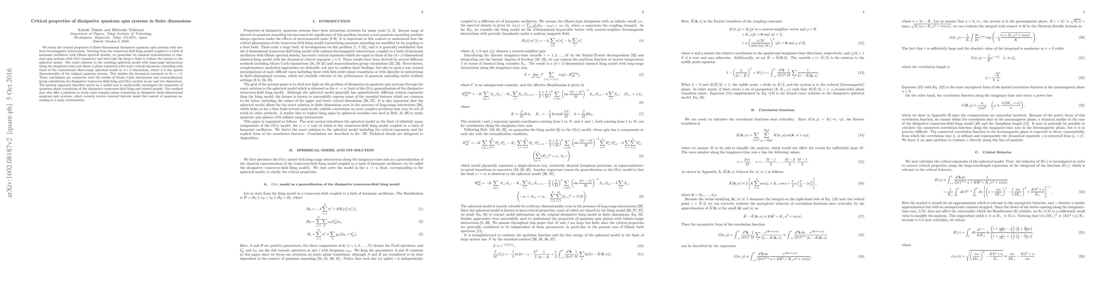 This paper investigates the critical properties of dissipative quantum spin systems, focusing on the transverse-field Ising model coupled to a dissipative environment. The study reveals a phase transition with critical exponents matching those of the conventional short-range spherical model, indicating a dynamical exponent of $z=2$, and aligns with Monte Carlo and renormalization group results.