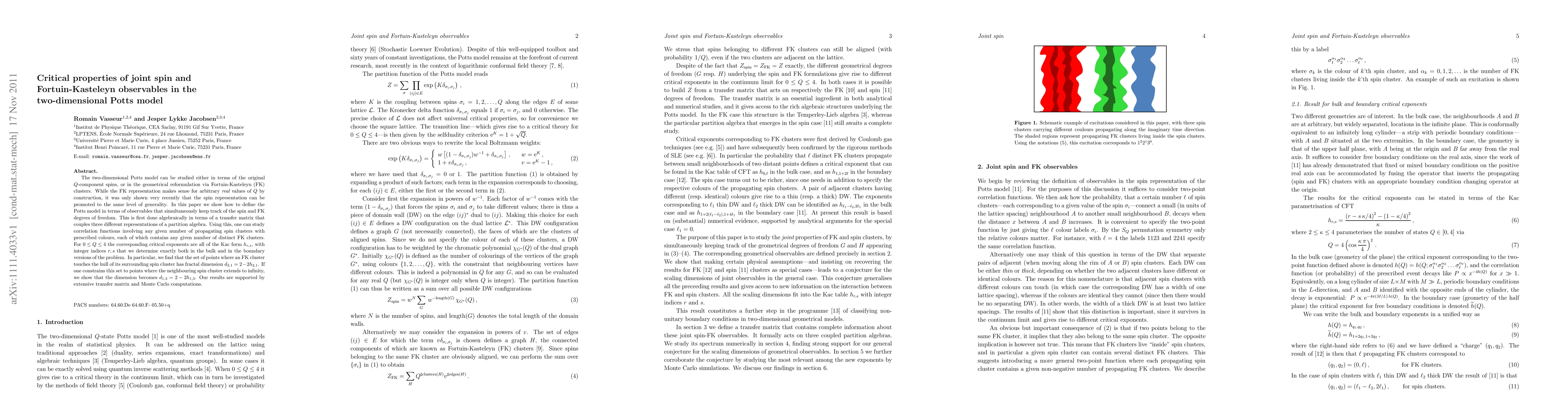 This paper defines the two-dimensional Potts model using joint spin and Fortuin-Kasteleyn observables, determining critical exponents for 0 <= Q <= 4 in both bulk and boundary versions. The study reveals fractal dimensions for specific cluster interactions, supported by transfer matrix and Monte Carlo computations.