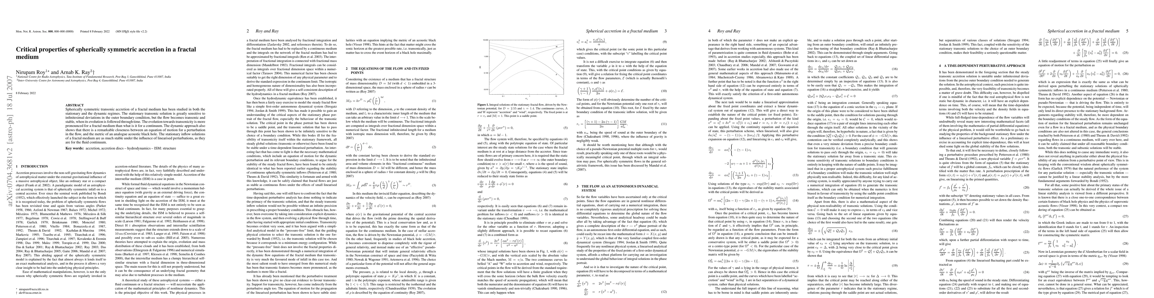 This paper investigates the critical properties of spherically symmetric accretion in a fractal medium, finding that stationary transonic solutions are sensitive to boundary conditions but become stable over time. The dynamic evolution towards transonicity is more pronounced in fractal media compared to continuum, and the flow's perturbation dynamics closely resembles the metric of an analogue acoustic black hole.