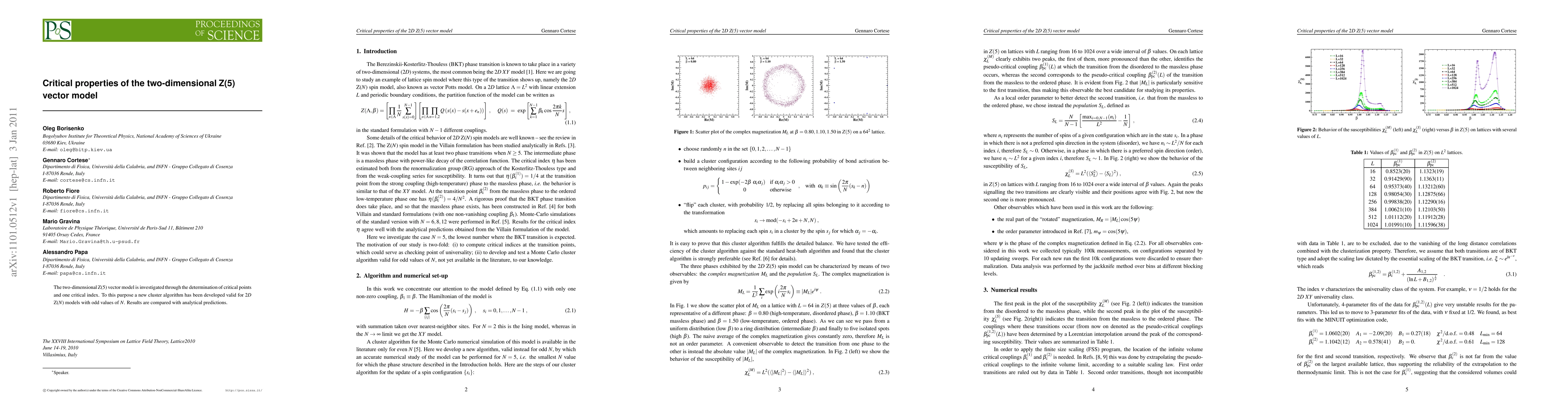 The two-dimensional Z(5) vector model is investigated through the determination of critical points and one critical index. To this purpose a new cluster algorithm has been developed valid for 2D Z(N) models with odd values of N. Results are compared with analytical predictions.
