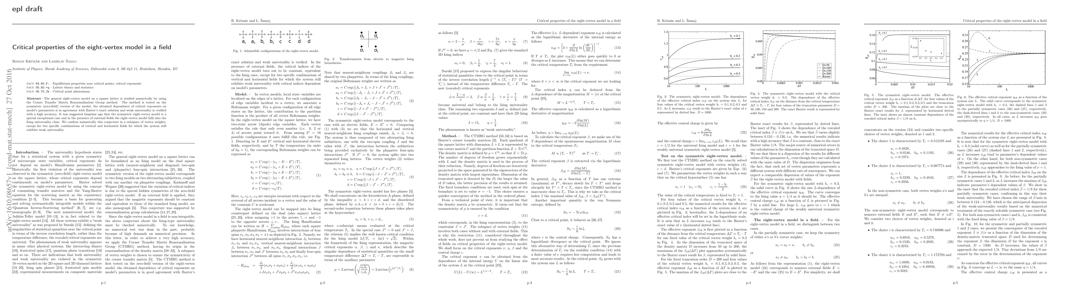 This paper numerically investigates the eight-vertex model on a square lattice using the Corner Transfer Matrix Renormalization Group method, confirming its Ising universality in most cases except for specific field combinations, and verifying weak universality in agreement with Baxter's exact solution.