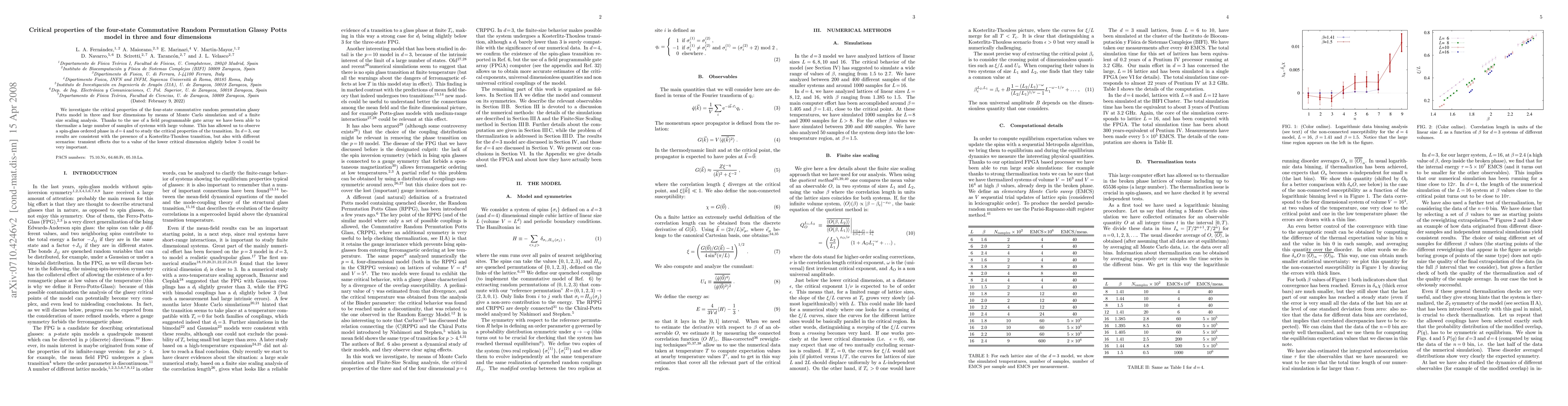 We investigate the critical properties of the four-state commutative random permutation glassy Potts model in three and four dimensions by means of Monte Carlo simulation and of a finite size scaling analysis. Thanks to the use of a field programmable gate array we have been able to thermalize a large number of samples of systems with large volume. This has allowed us to observe a spin-glass ordered phase in d=4 and to study the critical properties of the transition. In d=3, our results are consistent with the presence of a Kosterlitz-Thouless transition, but we cannot exclude transient effects due to a value of the lower critical dimension slightly below 3.