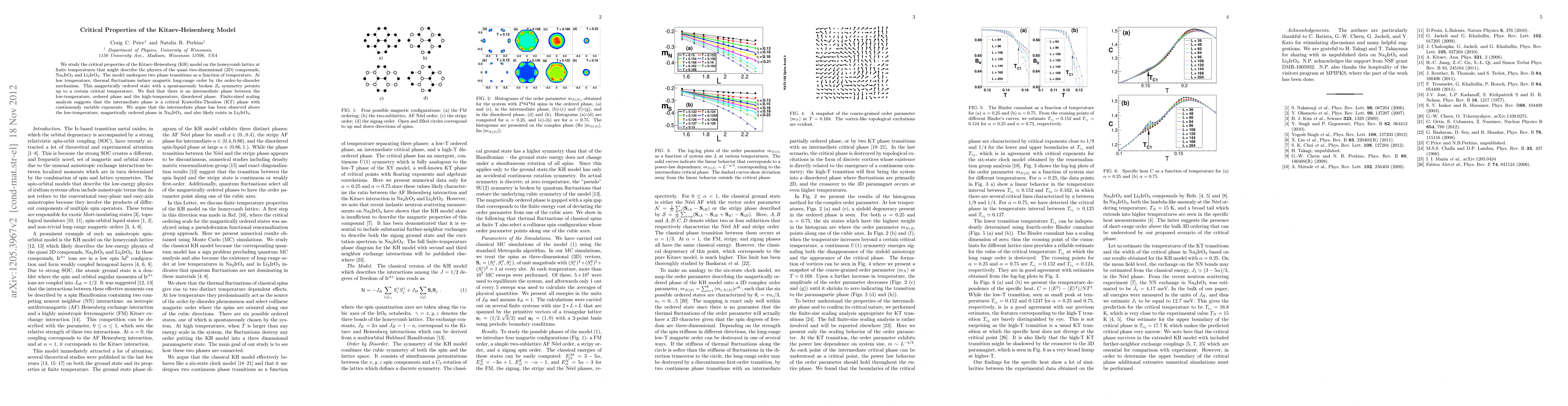 This paper investigates the critical properties of the Kitaev-Heisenberg model on the honeycomb lattice, identifying two phase transitions with an intermediate Kosterlitz-Thouless critical phase observed in quasi-two-dimensional compounds Na$_2$IrO$_3$ and Li$_2$IrO$_3$. The study reveals a magnetically ordered state with $Z_6$ symmetry at low temperatures transitioning to a disordered phase.