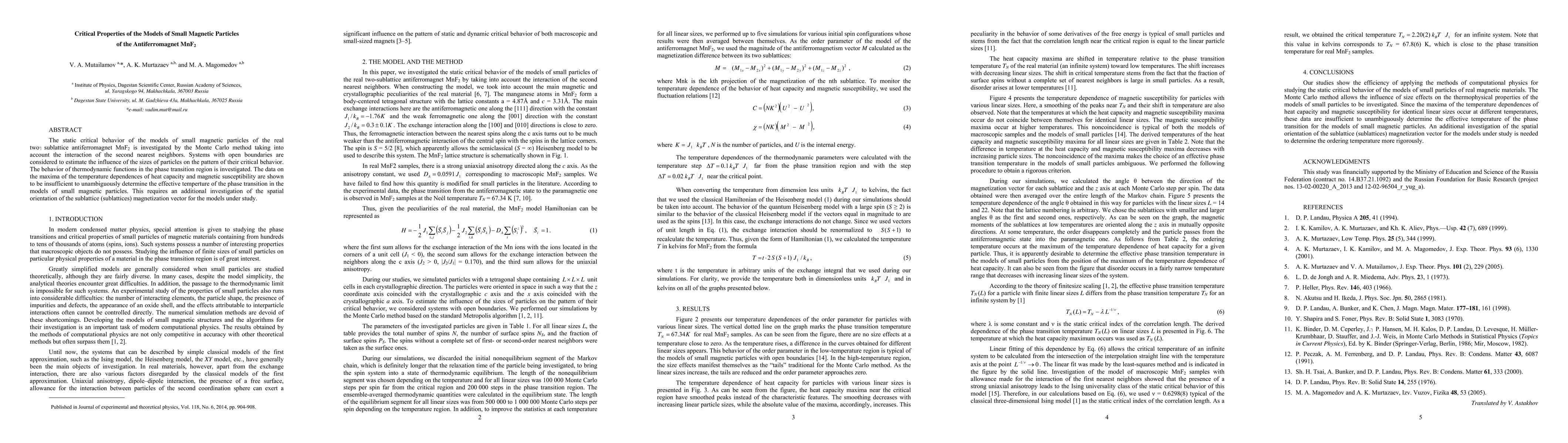 The static critical behavior of the models of small magnetic particles of the real two sublattice antiferromagnet MnF2 is investigated by the Monte Carlo method taking into account the interaction of the second nearest neighbors. Systems with open boundaries are considered to estimate the influence of the sizes of particles on the pattern of their critical behavior. The behavior of thermodynamic functions in the phase transition region is investigated. The data on the maxima of the temperature dependences of heat capacity and magnetic susceptibility are shown to be insufficient to unambiguously determine the effective temperture of the phase transition in the models of small magnetic particles. This requires an additional investigation of the spatial orientation of the sublattice (sublattices) magnetization vector for the models under study.