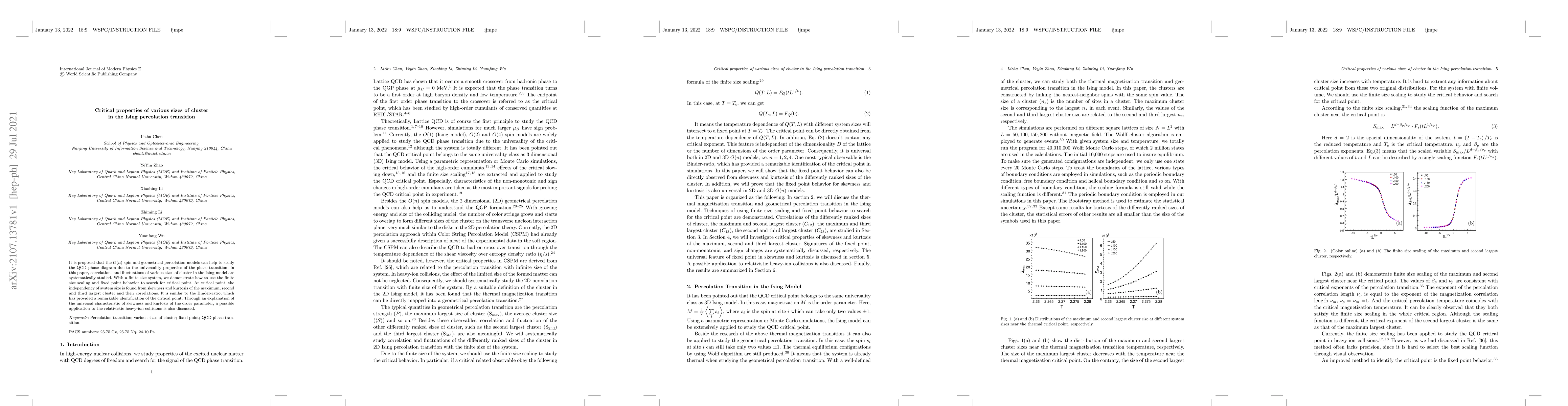 It is proposed that the $O(n)$ spin and geometrical percolation models can help to study the QCD phase diagram due to the universality properties of the phase transition. In this paper, correlations and fluctuations of various sizes of cluster in the Ising model are systematically studied. With a finite size system, we demonstrate how to use the finite size scaling and fixed point behavior to search for critical point. At critical point, the independency of system size is found from skewness and kurtosis of the maximum, second and third largest cluster and their correlations. It is similar to the Binder-ratio, which has provided a remarkable identification of the critical point. Through an explanation of the universal characteristic of skewness and kurtosis of the order parameter, a possible application to the relativistic heavy-ion collisions is also discussed.