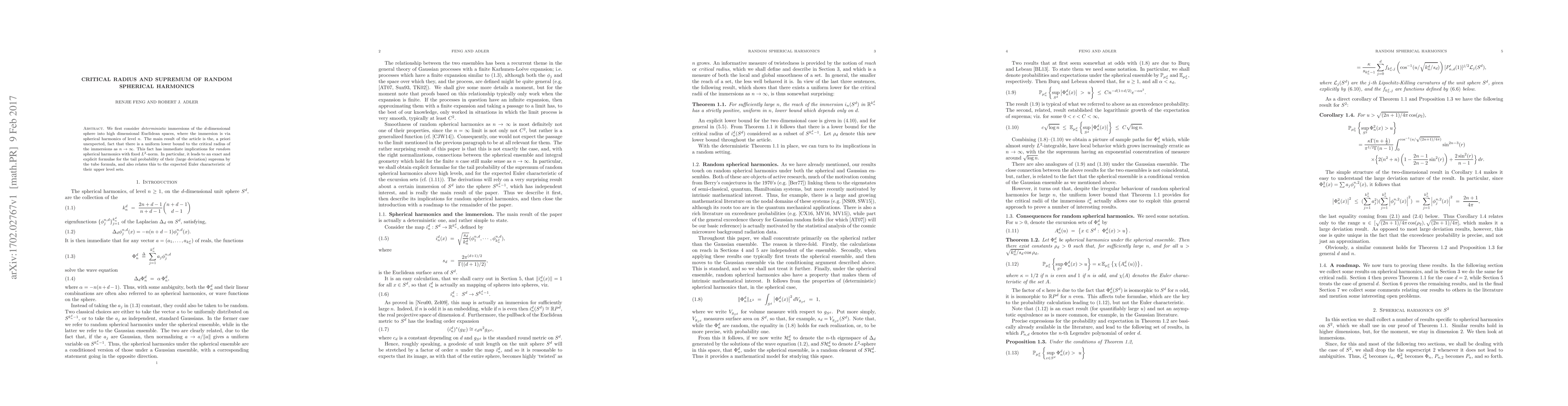 We first consider {\it deterministic} immersions of the $d$-dimensional sphere into high dimensional Euclidean spaces, where the immersion is via spherical harmonics of level $n$. The main result of the article is the, a priori unexpected, fact that there is a uniform lower bound to the critical radius of the immersions as $n\to\infty$. This fact has immediate implications for {\it random} spherical harmonics with fixed $L^2$-norm. In particular, it leads to an exact and explicit formulae for the tail probability of their (large deviation) suprema by the tube formula, and also relates this to the expected Euler characteristic of their upper level sets.