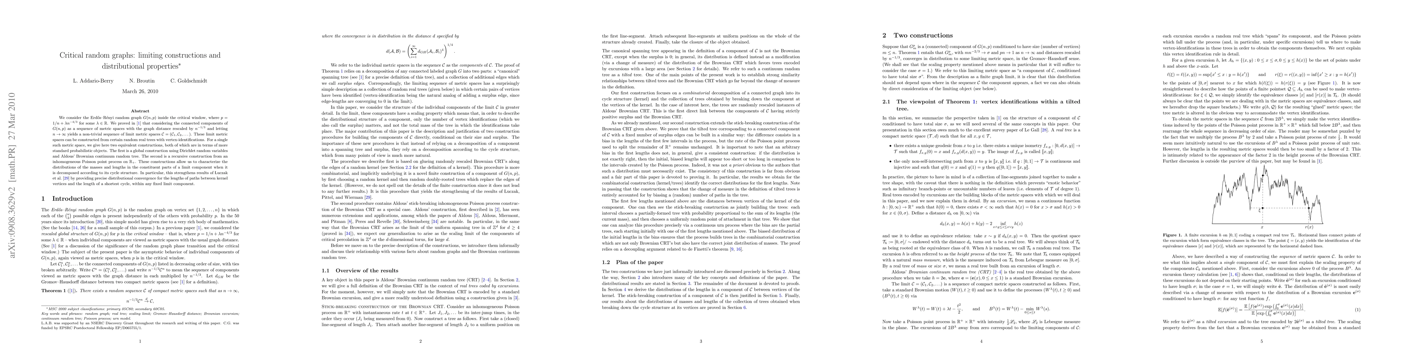 The paper explores critical random graphs with a specific probability structure, deriving two equivalent constructions to analyze their limit metric spaces. It characterizes the distributional properties of masses and lengths within these components.