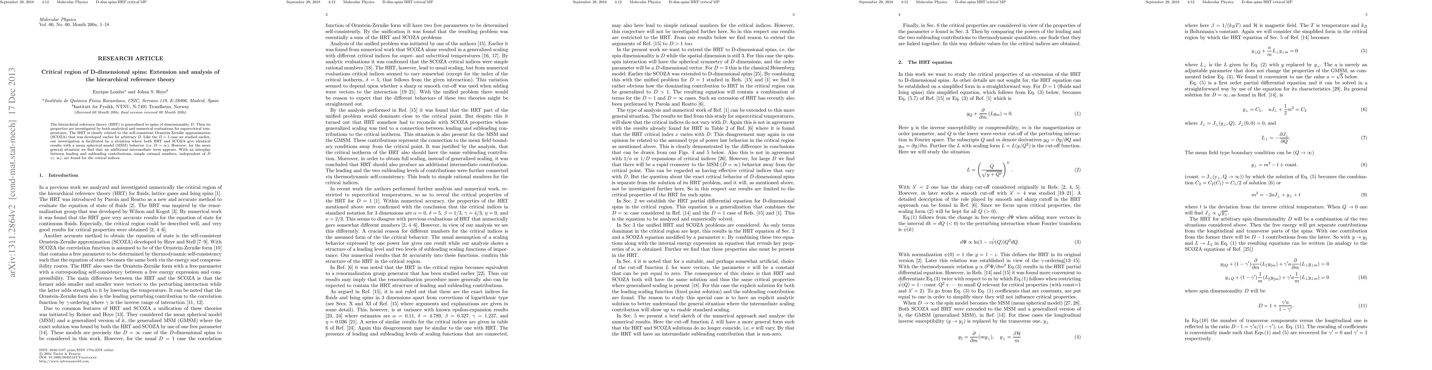The hierarchical reference theory (HRT) is generalized to spins of dimensionality $D$. Then its properties are investigated by both analytical and numerical evaluations for supercritical temperatures. The HRT is closely related to the self-consistent Ornstein-Zernike approximation (SCOZA) that was developed earlier for arbitrary $D$. Like the $D=1$ case we studied earlier, our investigation is facilitated by a situation where both HRT and SCOZA give identical results with a mean spherical model (MSM) behavior (i.e. $D=\infty$). However, for the more general situation we find that an additional intermediate term appears. With an interplay between leading and subleading contributions, simple rational numbers, independent of $D$ ($<\infty$), are found for the critical indices.