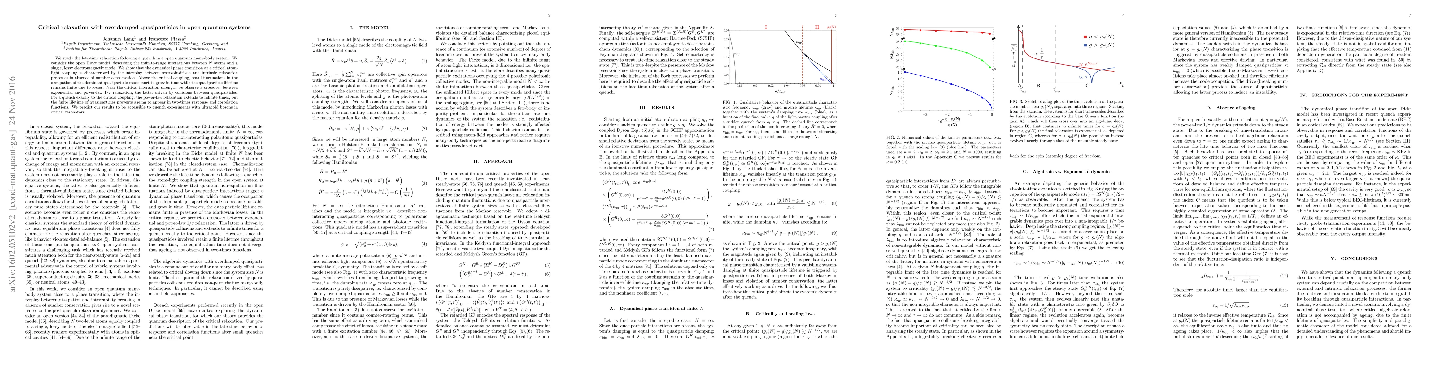 We study the late-time relaxation following a quench in a driven-dissipative quantum many-body system. We consider the open Dicke model, describing the infinite-range interactions between $N$ atoms and a single, lossy electromagnetic mode. We show that the dynamical phase transition at a critical atom-light coupling is characterized by the interplay between reservoir-driven and intrinsic relaxation processes. Above the critical coupling, small fluctuations in the occupation of the dominant quasiparticle-mode start to grow in time while the quasiparticle lifetime remains finite due to losses. Near the critical interaction strength we observe a crossover between exponential and power-law $1/\tau$ relaxation, the latter driven by collisions between quasiparticles. For a quench exactly to the critical coupling, the power-law relaxation extends to infinite times, but the finite lifetime of quasiparticles prevents ageing to appear. We predict our results to be accessible to quench experiments with ultracold bosons in optical resonators.