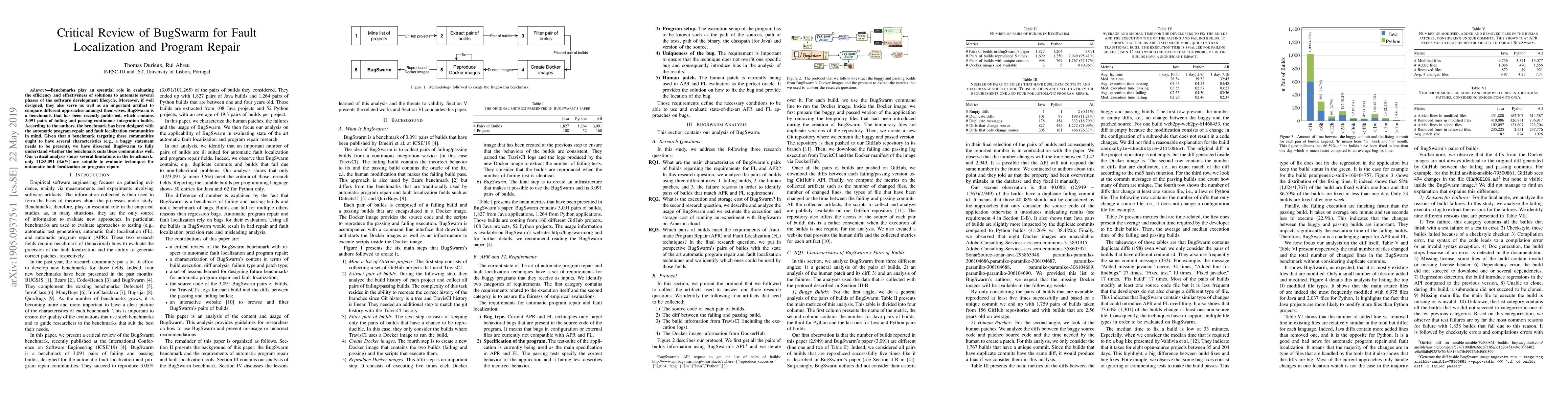 A benchmark called BugSwarm is reviewed for its suitability in evaluating automatic program repair and fault localization techniques. It was found to have significant limitations, with only 3.6% of the provided data suitable for evaluation.