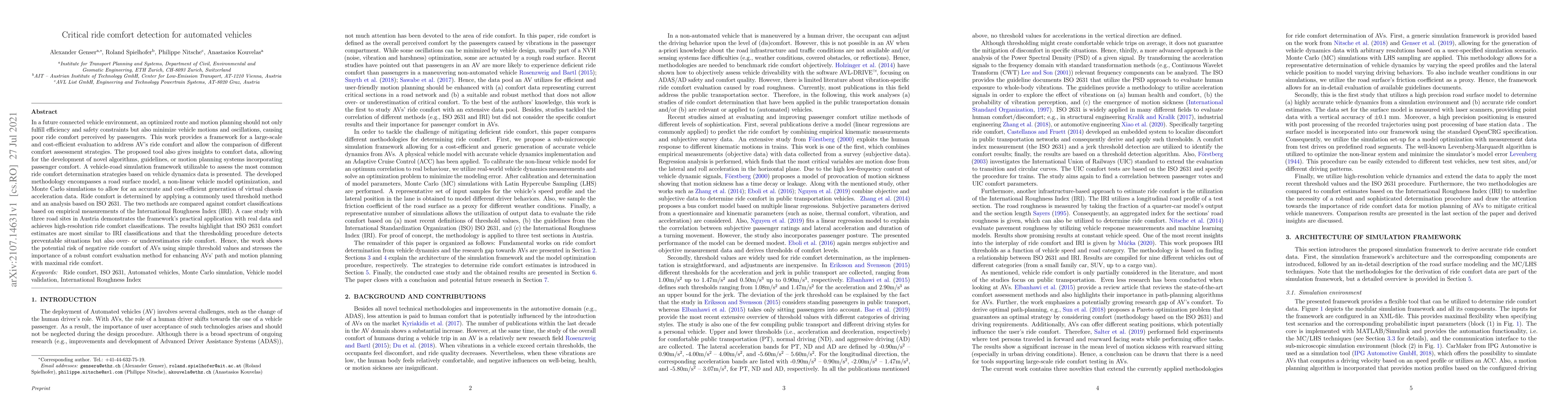 In a future connected vehicle environment, an optimized route and motion planning should not only fulfill efficiency and safety constraints but also minimize vehicle motions and oscillations, causing poor ride comfort perceived by passengers. This work provides a framework for a large-scale and cost-efficient evaluation to address AV's ride comfort and allow the comparison of different comfort assessment strategies. The proposed tool also gives insights to comfort data, allowing for the development of novel algorithms, guidelines, or motion planning systems incorporating passenger comfort. A vehicle-road simulation framework utilizable to assess the most common ride comfort determination strategies based on vehicle dynamics data is presented. The developed methodology encompasses a road surface model, a non-linear vehicle model optimization, and Monte Carlo simulations to allow for an accurate and cost-efficient generation of virtual chassis acceleration data. Ride comfort is determined by applying a commonly used threshold method and an analysis based on ISO 2631. The two methods are compared against comfort classifications based on empirical measurements of the International Roughness Index (IRI). A case study with three road sites in Austria demonstrates the framework's practical application with real data and achieves high-resolution ride comfort classifications. The results highlight that ISO 2631 comfort estimates are most similar to IRI classifications and that the thresholding procedure detects preventable situations but also over- or underestimates ride comfort. Hence, the work shows the potential risk of negative ride comfort of AVs using simple threshold values and stresses the importance of a robust comfort evaluation method for enhancing AVs' path and motion planning with maximal ride comfort.