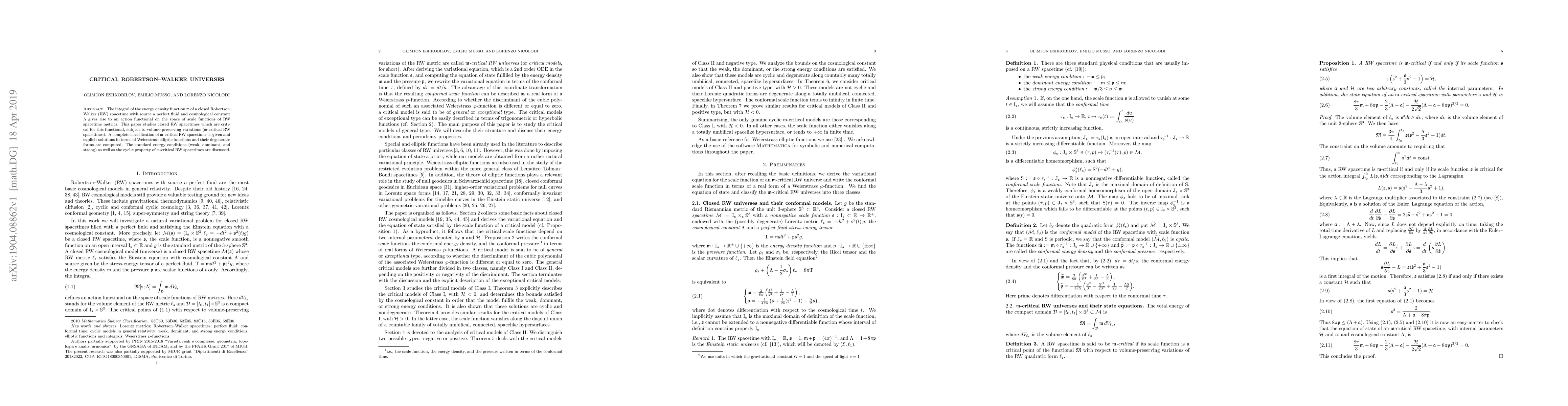 The integral of the energy density function $\mathfrak m$ of a closed Robertson-Walker (RW) spacetime with source a perfect fluid and cosmological constant $\Lambda$ gives rise to an action functional on the space of scale functions of RW spacetime metrics. This paper studies closed RW spacetimes which are critical for this functional, subject to volume-preserving variations (critical RW spacetimes). A complete classification of critical RW spacetimes is given and explicit solutions in terms of Weierstrass elliptic functions and their degenerate forms are computed. The standard energy conditions (weak, dominant, and strong) as well as the cyclic property of critical RW spacetimes are discussed.