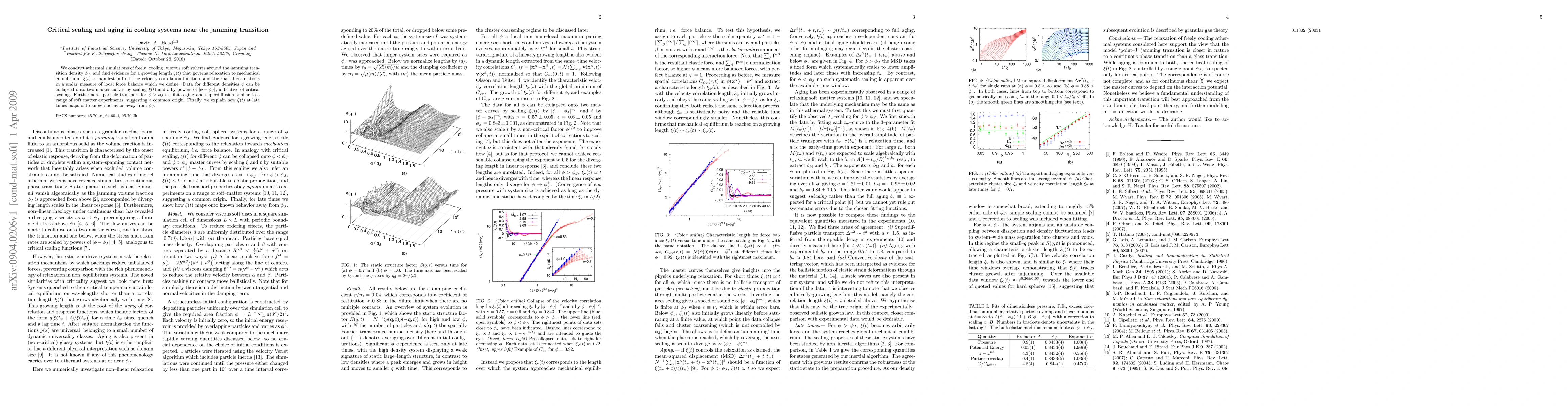 This study investigates the critical scaling and aging phenomena in cooling systems of viscous soft spheres near the jamming transition density. The research reveals a growing length \xi(t) that governs relaxation, with data collapsing onto master curves indicating critical scaling behavior.