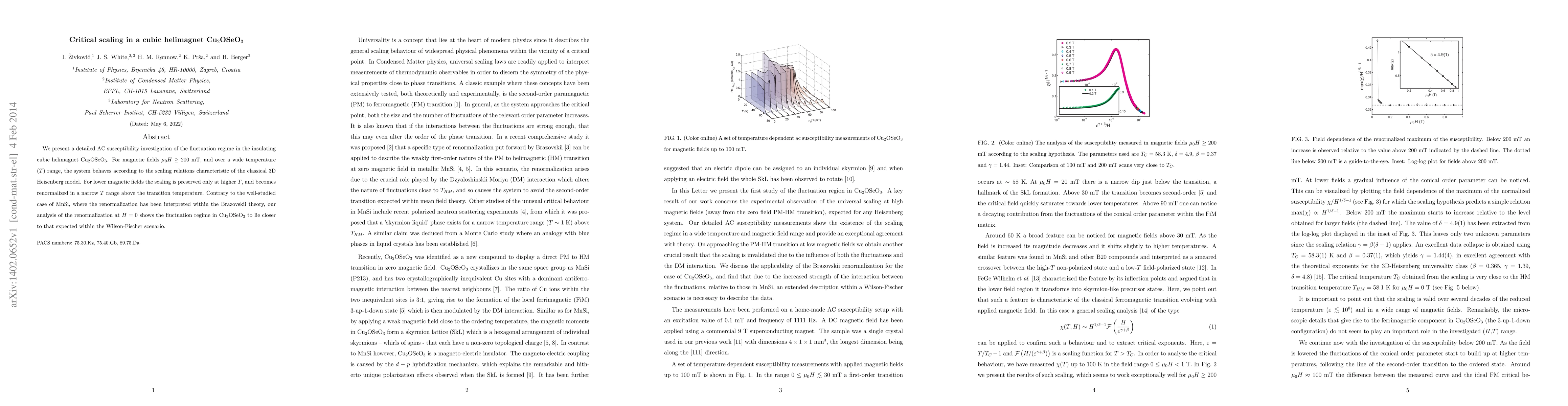 We present a detailed AC susceptibility investigation of the fluctuation regime in the insulating cubic helimagnet Cu2OSeO3. For magnetic fields mu_0 H >= 200 mT, and over a wide temperature range, the system behaves according to the scaling relations characteristic of the classical 3D Heisenberg model. For lower magnetic fields the scaling is preserved only at higher T, and becomes renormalized in a narrow T range above the transition temperature. Contrary to the well-studied case of MnSi, where the renormalization has been interpreted within the Brazovskii theory, our analysis of the renormalization at H = 0 shows the fluctuation regime in Cu2OSeO3 to lie closer to that expected within the Wilson-Fischer scenario.