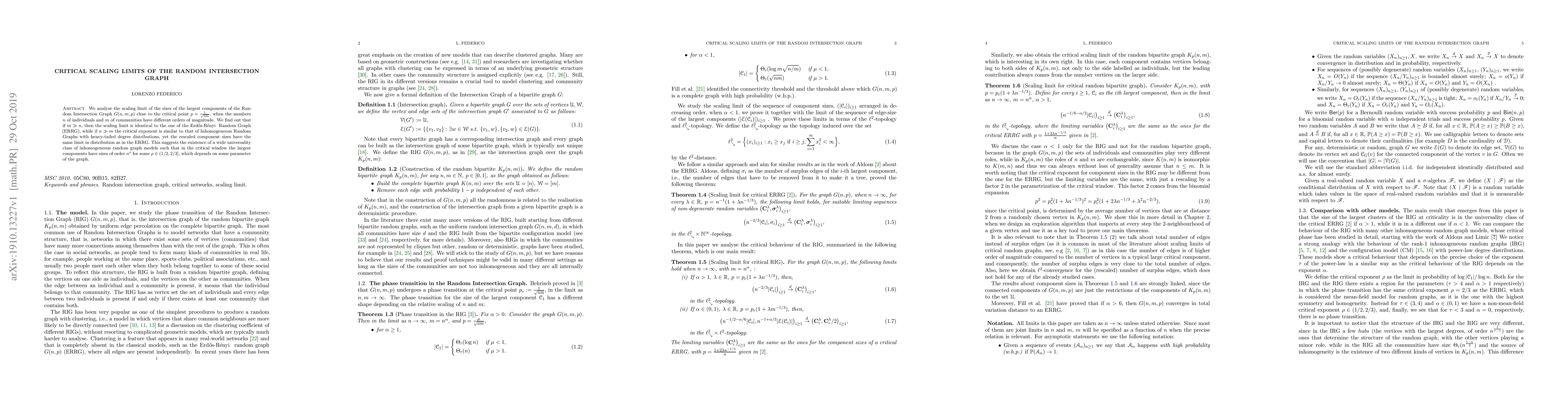 This paper investigates the critical scaling limits of the largest components in Random Intersection Graphs near the critical point, revealing that the behavior depends on the relative sizes of individuals and communities. When communities dominate, the scaling limit resembles that of the ER Random Graph, while when individuals dominate, it aligns with Inhomogeneous Random Graphs, yet retains the same rescaled component sizes as the ER model.