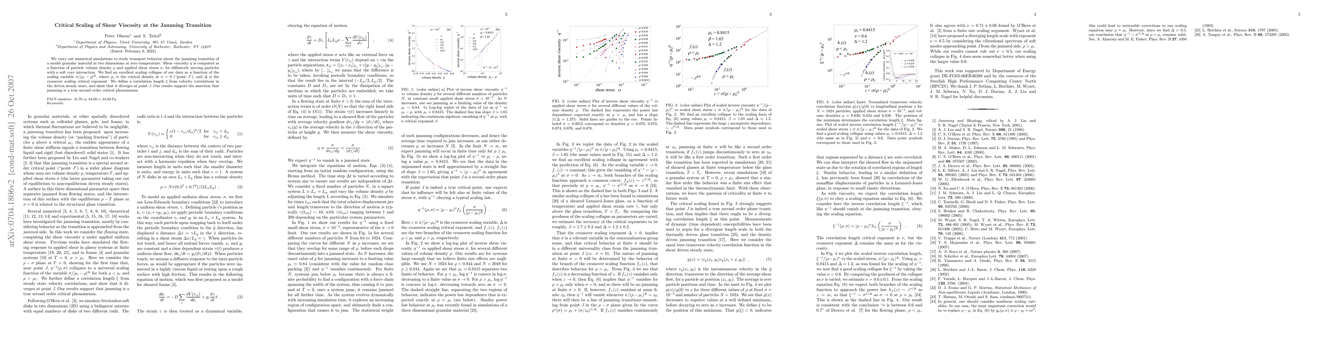 This paper reports numerical simulations revealing the critical scaling behavior of shear viscosity near the jamming transition in two-dimensional granular materials at zero temperature. The study shows that shear viscosity scales with a critical exponent as the system approaches the critical density, indicating jamming as a critical phenomenon.