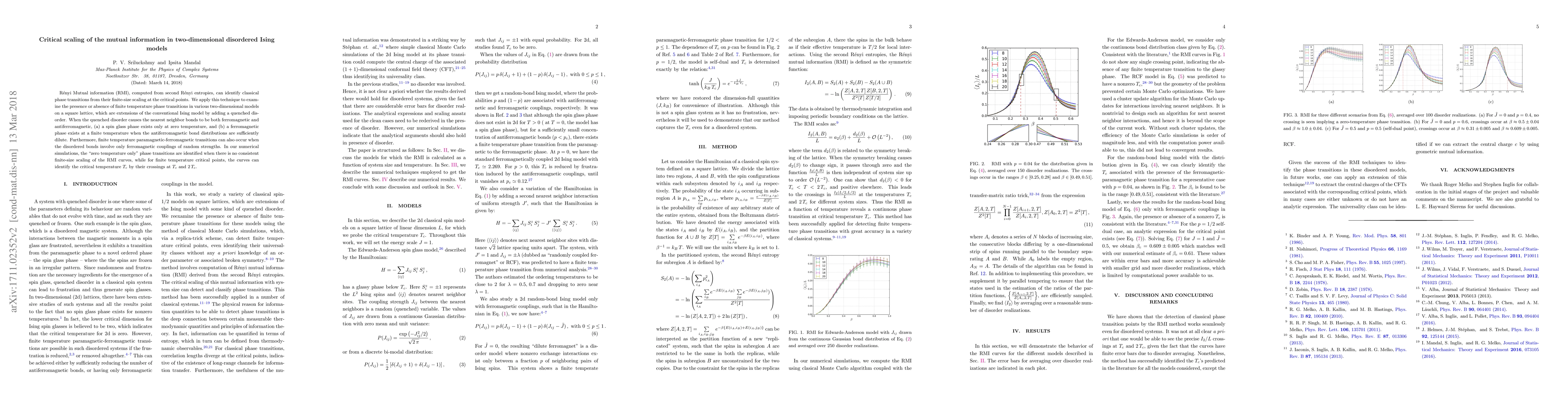 This paper investigates the critical scaling of Renyi Mutual Information in two-dimensional disordered Ising models to identify phase transitions. It finds that zero-temperature spin glass phases vanish with disorder, while finite-temperature transitions occur under specific dilute antiferromagnetic or purely ferromagnetic bond distributions.