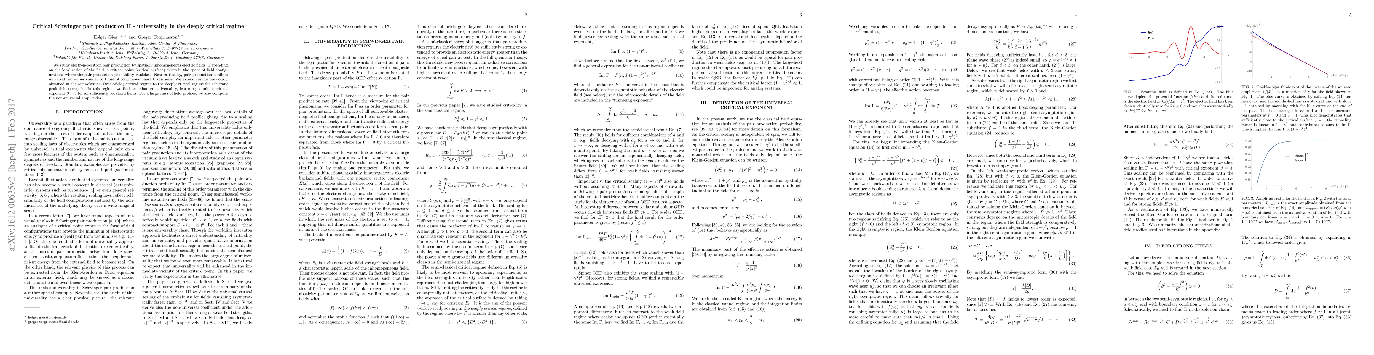 We study electron-positron pair production by spatially inhomogeneous electric fields. Depending on the localization of the field, a critical point (critical surface) exists in the space of field configurations where the pair production probability vanishes. Near criticality, pair production exhibits universal properties similar to those of continuous phase transitions. We extend results previously obtained in the semi-classical (weak-field) critical regime to the deeply critical regime for arbitrary peak field strength. In this regime, we find an enhanced universality, featuring a unique critical exponent $\beta=3$ for all sufficiently localized fields. For a large class of field profiles, we also compute the non-universal amplitudes.