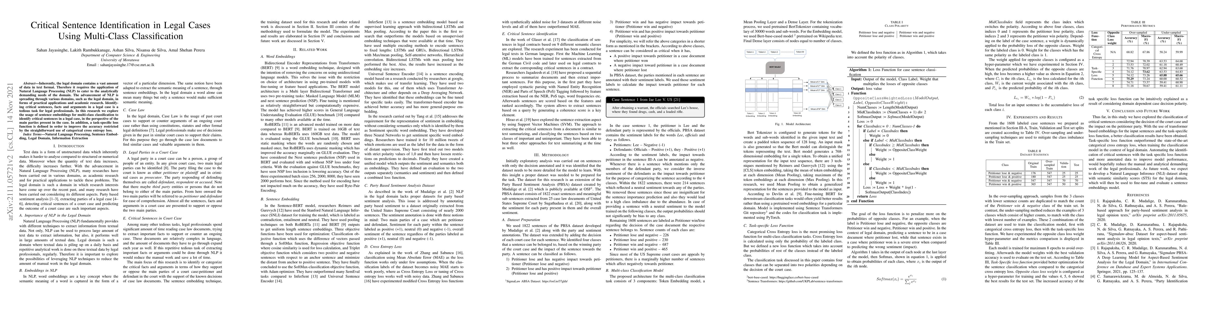 This research utilizes sentence embeddings and multi-class classification to identify critical sentences in legal cases, aiming to assist legal professionals. It introduces a task-specific loss function to enhance accuracy beyond standard categorical cross-entropy, addressing the analytical demands of the legal domain.
