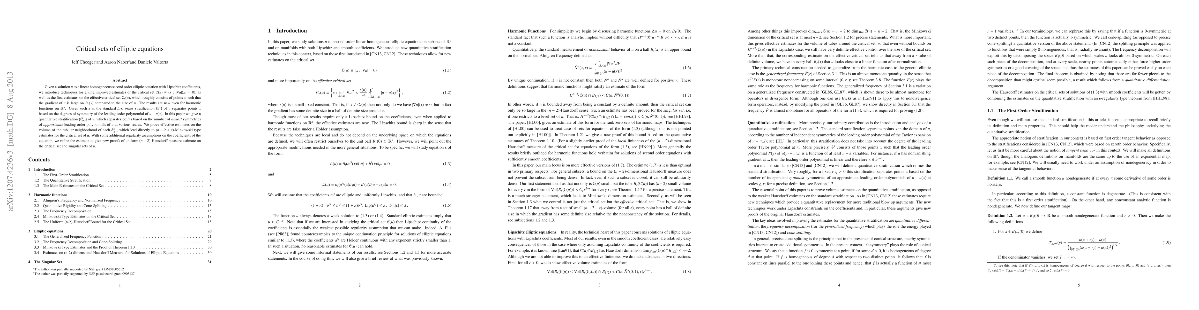 Given a solution $u$ to a linear homogeneous second order elliptic equation with Lipschitz coefficients, we introduce techniques for giving improved estimates of the critical set $\Cr(u)\equiv \{x:|\nabla u|(x)=0\}$. The results are new even for harmonic functions on $\dR^n$. Given such a $u$, the standard {\it first order} stratification $\{\cS^k\}$ of $u$ separates points $x$ based on the degrees of symmetry of the leading order polynomial of $u-u(x)$. In this paper we give a quantitative stratification $\{\cS^k_{\eta,r}\}$ of $u$, which separates points based on the number of {\it almost} symmetries of {\it approximate} leading order polynomials of $u$ at various scales. We prove effective estimates on the volume of the tubular neighborhood of each $\cS^k_{\eta,r}$, which lead directly to $(n-2+\epsilon)$-Minkowski content estimates for the critical set of $u$. With some additional regularity assumptions on the coefficients of the equation, we refine the estimate to a uniform $(n-2)$-Hausdorff measure estimate on the critical set of $u$.