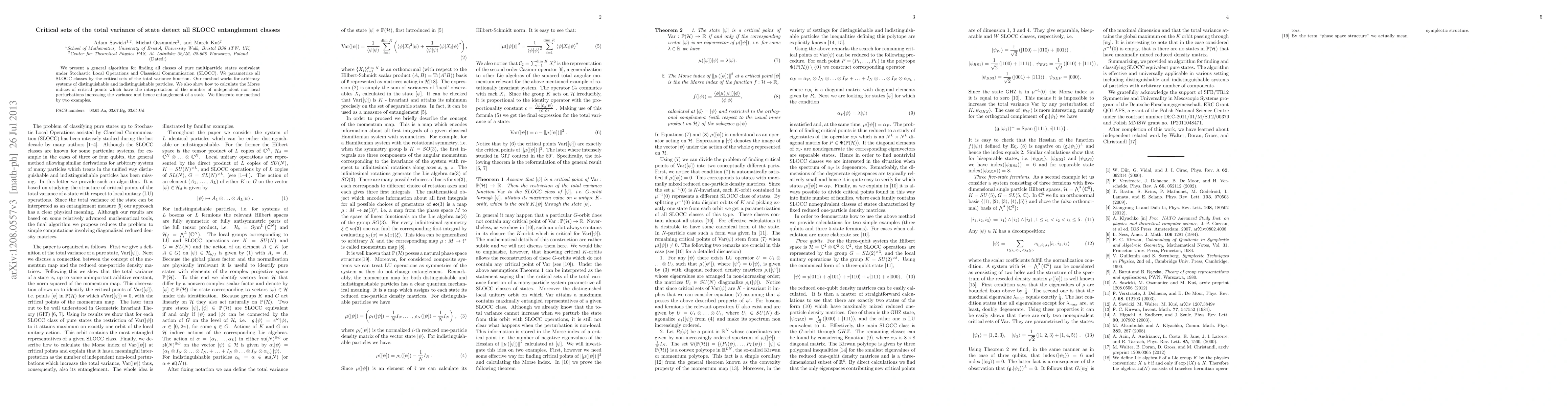 We present a general algorithm for finding all classes of pure multiparticle states equivalent under Stochastic Local Operations and Classsical Communication (SLOCC). We parametrize all SLOCC classes by the critical sets of the total variance function. Our method works for arbitrary systems of distinguishable and indistinguishable particles. We also discuss the Morse indices of critical points which have the interpretation of the number of independent non-local perturbations increasing the variance and hence entanglement of a state. We illustrate our method by two examples.