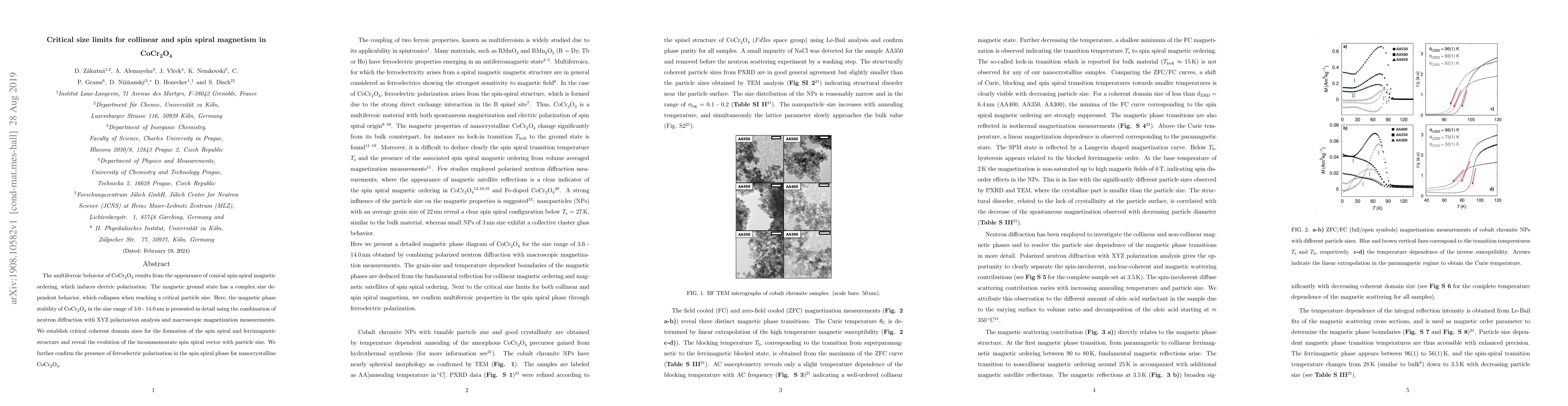 This paper investigates the magnetic phase stability of CoCr$_2$O$_4$ nanoparticles, revealing critical size limits for the formation of spin spiral and ferrimagnetic structures. Using neutron diffraction and magnetization measurements, the study establishes coherent domain sizes for these magnetic orderings and confirms ferroelectric polarization in the spin spiral phase.