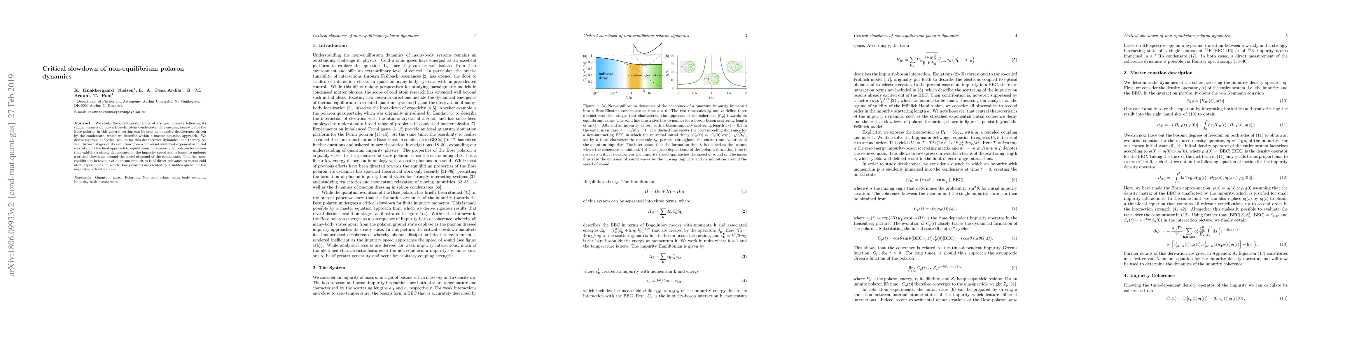 This paper investigates the quantum dynamics of a single impurity immersed into a Bose-Einstein condensate, focusing on the formation of a Bose polaron and its decoherence. The study reveals a critical slowdown in the polaron formation time around the speed of sound, highlighting distinct stages of evolution from initial stretched exponential relaxation to equilibrium.