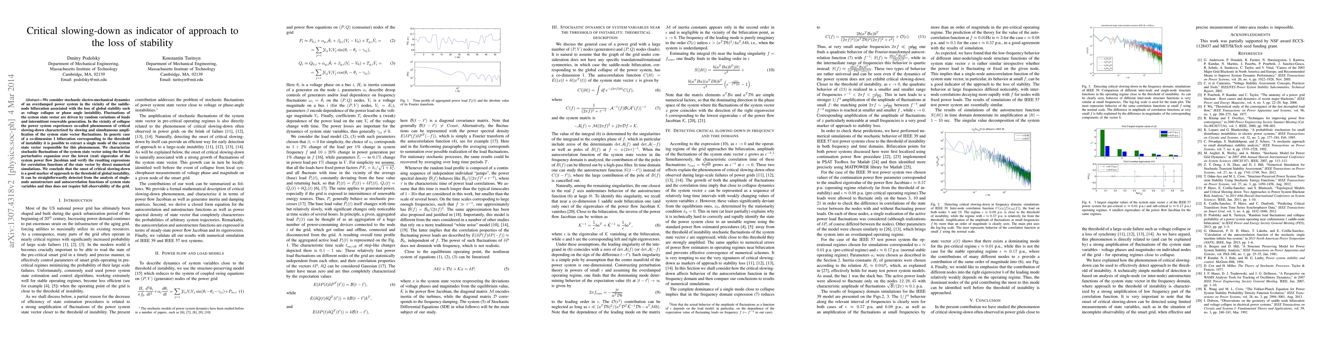 We consider stochastic electro-mechanical dynamics of an overdamped power system in the vicinity of the saddle-node bifurcation associated with the loss of global stability such as voltage collapse or phase angle instability. Fluctuations of the system state vector are driven by random variations of loads and intermittent renewable generation. In the vicinity of collapse the power system experiences so-called phenomenon of critical slowing-down characterized by slowing and simultaneous amplification of the system state vector fluctuations. In generic case of a co-dimension 1 bifurcation corresponding to the threshold of instability it is possible to extract a single mode of the system state vector responsible for this phenomenon. We characterize stochastic fluctuations of the system state vector using the formal perturbative expansion over the lowest (real) eigenvalue of the system power flow Jacobian and verify the resulting expressions for correlation functions of the state vector by direct numerical simulations. We conclude that the onset of critical slowing-down is a good marker of approach to the threshold of global instability. It can be straightforwardly detected from the analysis of single-node autostructure and autocorrelation functions of system state variables and thus does not require full observability of the grid.