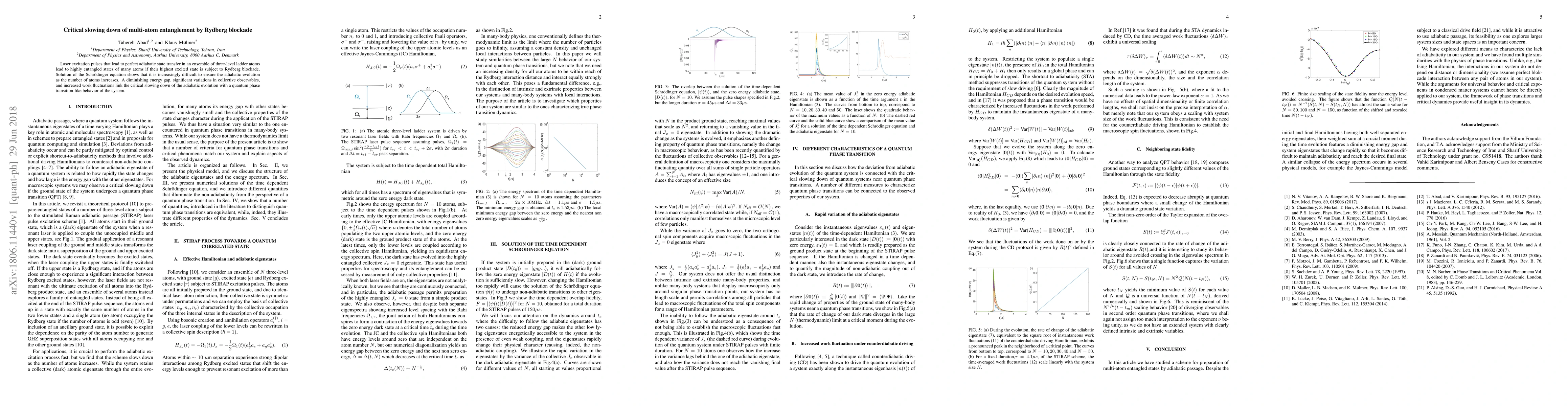 Laser excitation pulses that lead to perfect adiabatic state transfer in an ensemble of three-level ladder atoms lead to highly entangled states of many atoms if their highest excited state is subject to Rydberg blockade. Solution of the Schr\"odinger equation shows that it is increasingly difficult to ensure the adiabatic evolution as the number of atoms increases. A diminishing energy gap, significant variations in collective observables, and increased work fluctuations link the critical slowing down of the adiabatic evolution with a quantum phase transition-like behavior of the system.
