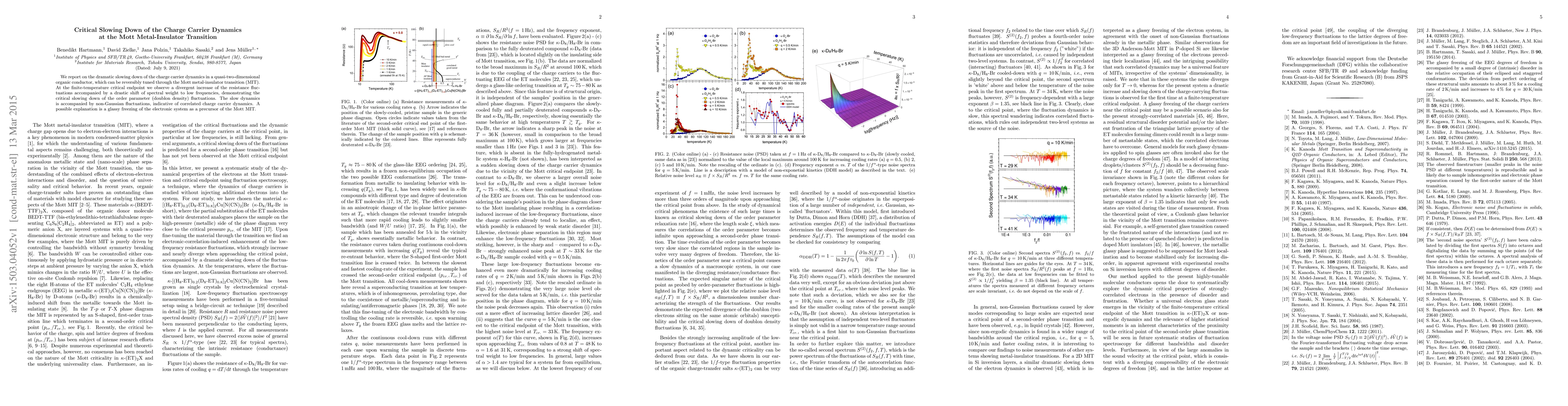 This study reveals the dramatic slowing down of charge carrier dynamics in a quasi-two-dimensional organic conductor during the Mott metal-insulator transition, marked by increased resistance fluctuations and spectral weight shift to low frequencies. The observed non-Gaussian fluctuations suggest correlated charge dynamics, hinting at a glassy freezing state preceding the transition.