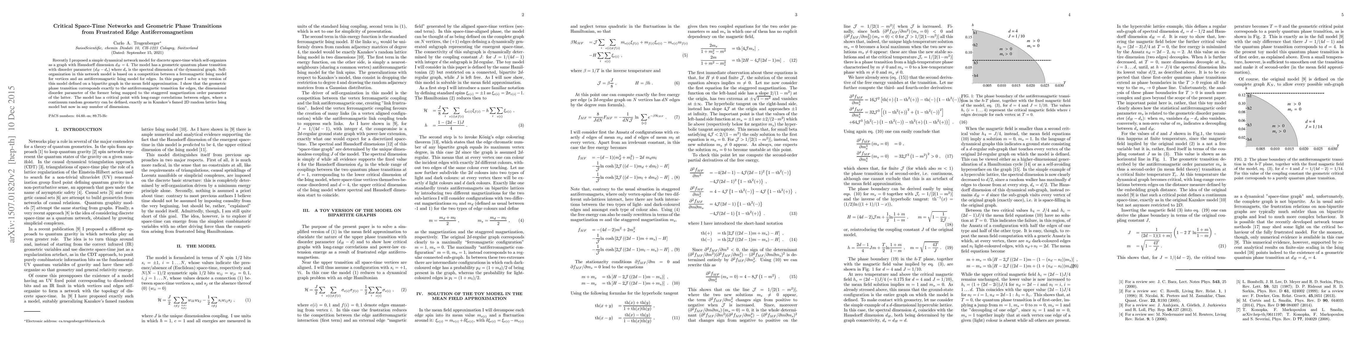 Recently I proposed a simple dynamical network model for discrete space-time which self-organizes as a graph with Hausdorff dimension d_H=4. The model has a geometric quantum phase transition with disorder parameter (d_H-d_s) where d_s is the spectral dimension of the dynamical graph. Self-organization in this network model is based on a competition between a ferromagnetic Ising model for vertices and an antiferromagnetic Ising model for edges. In this paper I solve a toy version of this model defined on a bipartite graph in the mean field approximation. I show that the geometric phase transition corresponds exactly to the antiferromagnetic transition for edges, the dimensional disorder parameter of the former being mapped to the staggered magnetization order parameter of the latter. The model has a critical point with long-range correlations between edges, where a continuum random geometry can be defined, exactly as in Kazakov's famed 2D random lattice Ising model but now in any number of dimensions.