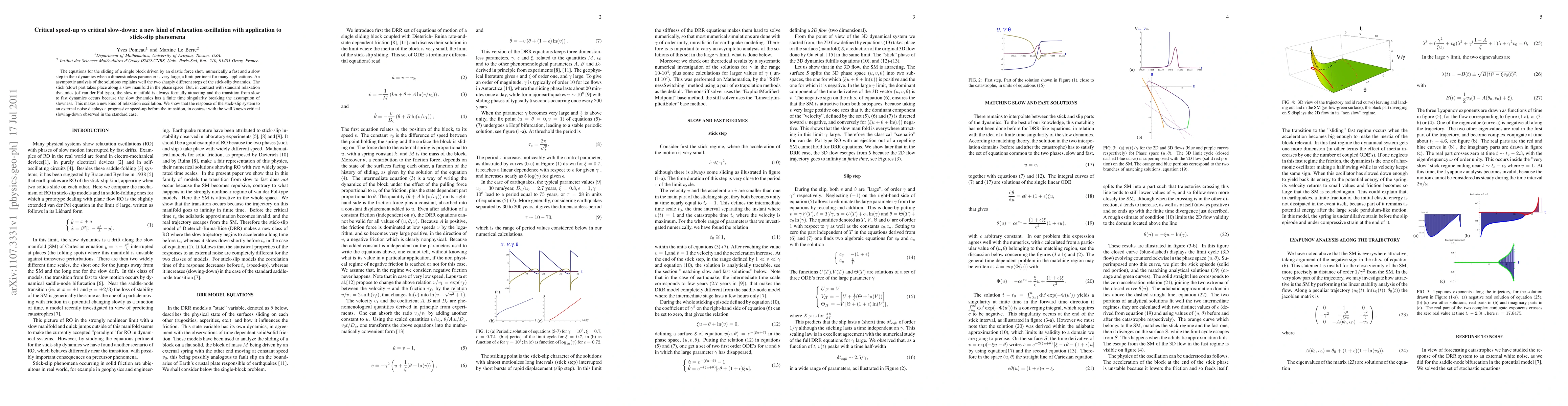 The equations for the sliding of a single block driven by an elastic force show numerically a fast and a slow step in their dynamics when a dimensionless parameter is very large, a limit pertinent for many applications. An asymptotic analysis of the solutions explains well the two sharply different steps of the stick-slip dynamics. The stick (slow) part takes place along a slow manifold in the phase space. But, in contrast with standard relaxation dynamics (of van der Pol type), the slow manifold is always formally attracting and the transition from slow to fast dynamics occurs because the slow dynamics has a finite time singularity breaking the assumption of slowness. This makes a new kind of relaxation oscillation. We show that the response of the stick-slip system to an external noise displays a progressive speed-up before the transition, in contrast with the well known critical slowing-down observed in the standard case.