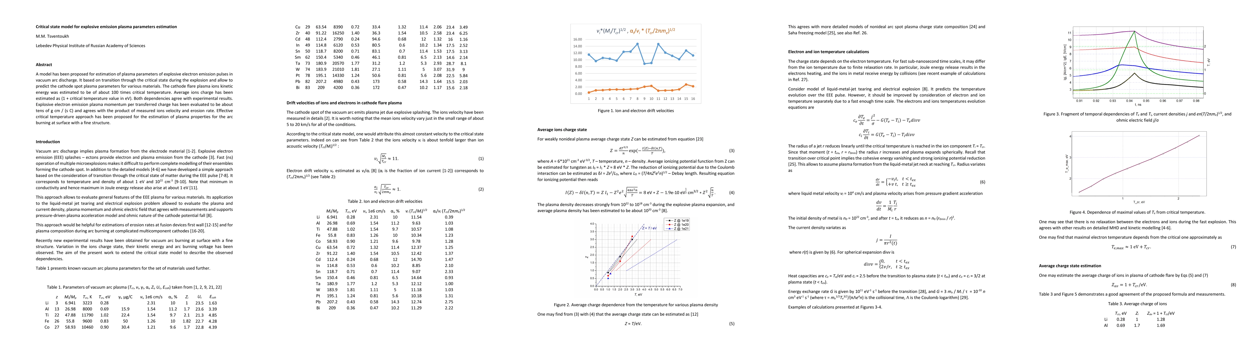 A model predicts plasma parameters of explosive electron emission pulses in vacuum arc discharge, estimating ions kinetic energy up to 100 times critical temperature and momentum per transferred charge.