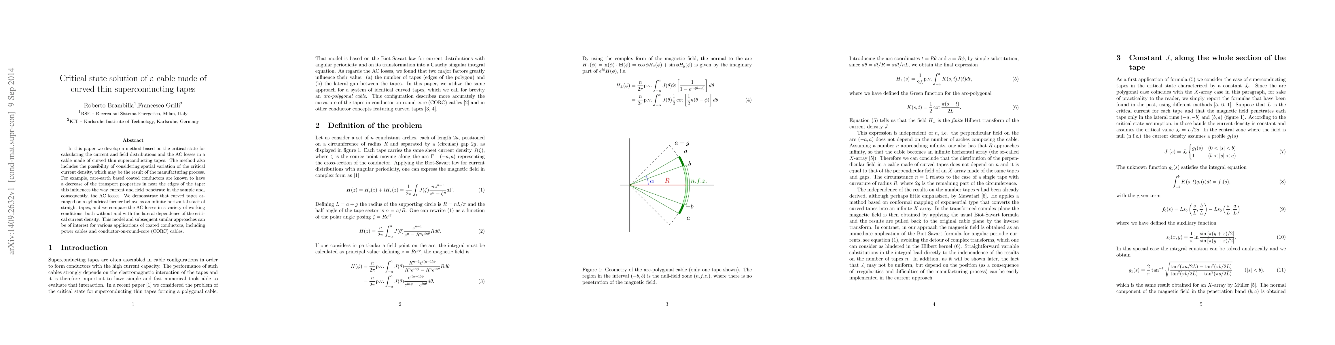 This paper proposes a critical state method to calculate current, field distributions, and AC losses in cables made of curved thin superconducting tapes, considering spatial variations in critical current density due to manufacturing. It demonstrates that curved tapes behave like an infinite stack of straight tapes and compares AC losses under different conditions.