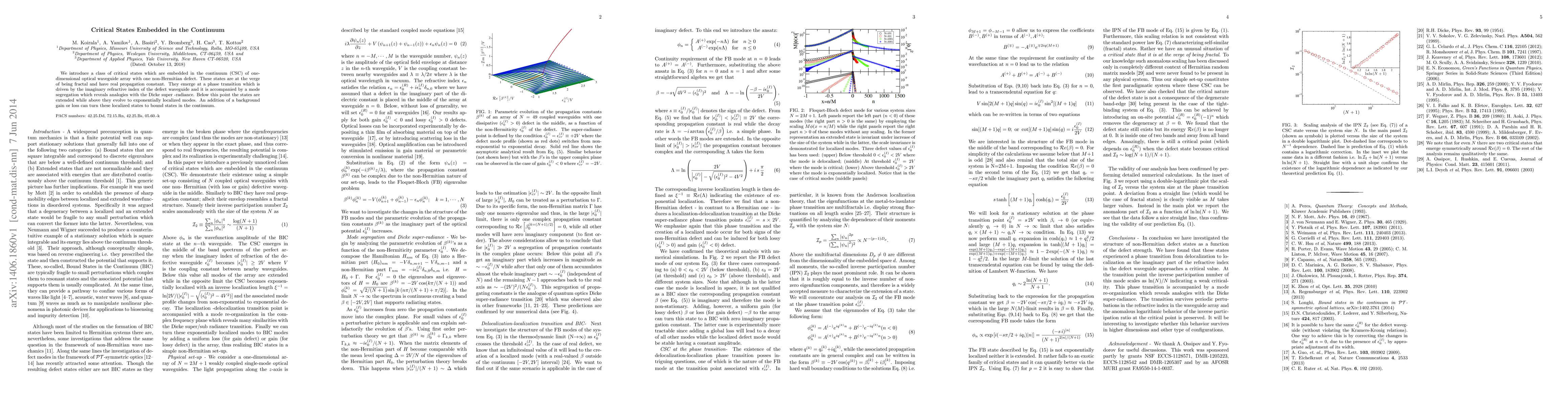 We introduce a class of critical states which are embedded in the continuum (CSC) of one-dimensional optical waveguide array with one non-Hermitian defect. These states are at the verge of being fractal and have real propagation constant. They emerge at a phase transition which is driven by the imaginary refractive index of the defect waveguide and it is accompanied by a mode segregation which reveals analogies with the Dicke super -radiance. Below this point the states are extended while above they evolve to exponentially localized modes. An addition of a background gain or loss can turn these localized states to bound states in the continuum.