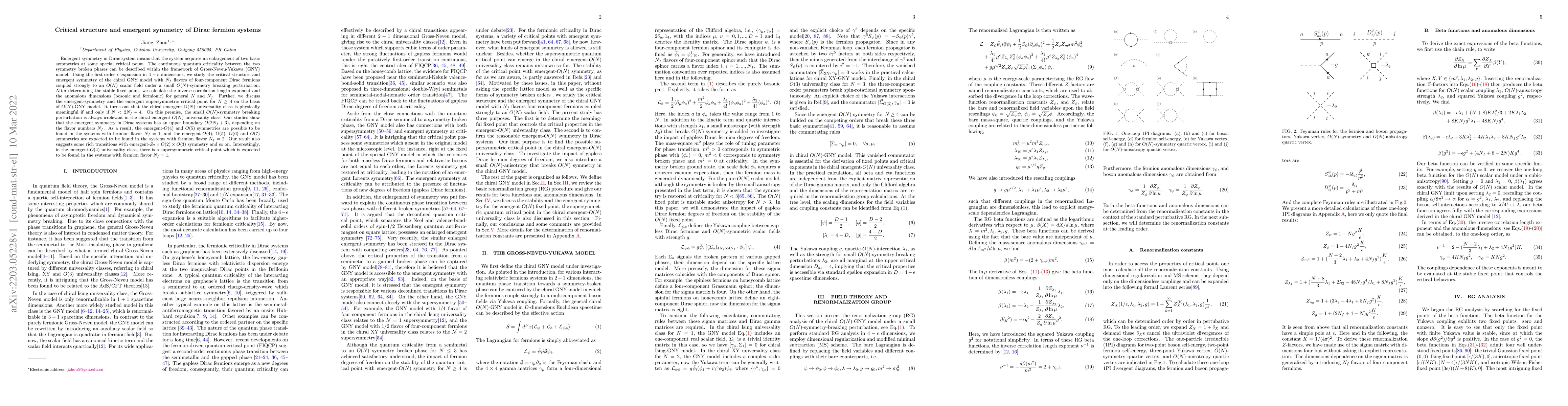 Emergent symmetry in Dirac system means that the system acquires an enlargement of two basic symmetries at some special critical point. The continuous quantum criticality between the two symmetry broken phases can be described within the framework of Gross-Neveu-Yukawa (GNY) model. Using the first-order $\epsilon$ expansion in $4-\epsilon$ dimensions, we study the critical structure and emergent symmetry of the chiral GNY model with $N_f$ flavors of four-component Dirac fermions coupled strongly to an $O(N)$ scalar field under a small $O(N)$-symmetry breaking perturbation. After determining the stable fixed point, we calculate the inverse correlation length exponent and the anomalous dimensions (bosonic and fermionic) for general $N$ and $N_f$. Further, we discuss the emergent-symmetry and the emergent supersymmetric critical point for $N\geq4$ on the basis of $O(N)$-GNY model. It turns out that the chiral emergent-$O(N)$ universality class is physically meaningful if and only if $N<2N_f+4$. On this premise, the small $O(N)$-symmetry breaking perturbation is always irrelevant in the chiral emergent-$O(N)$ universality class. Our studies show that the emergent symmetry in Dirac systems has an upper boundary $O(2N_f+3)$, depending on the flavor numbers $N_f$. As a result, the emergent-$O(4)$ and $O(5)$ symmetries are possible to be found in the systems with fermion flavor $N_f=1$, and the emergent-$O(4)$, $O(5)$, $O(6)$ and $O(7)$ symmetries are expected to be found in the systems with fermion flavor $N_f=2$. Our result also suggests some rich transitions with emergent-$Z_2\times O(2)\times O(3)$ symmetry and so on. Interestingly, in the emergent-$O(4)$ universality class, there is a supersymmetric critical point which is expected to be found in the systems with fermion flavor $N_f=1$.