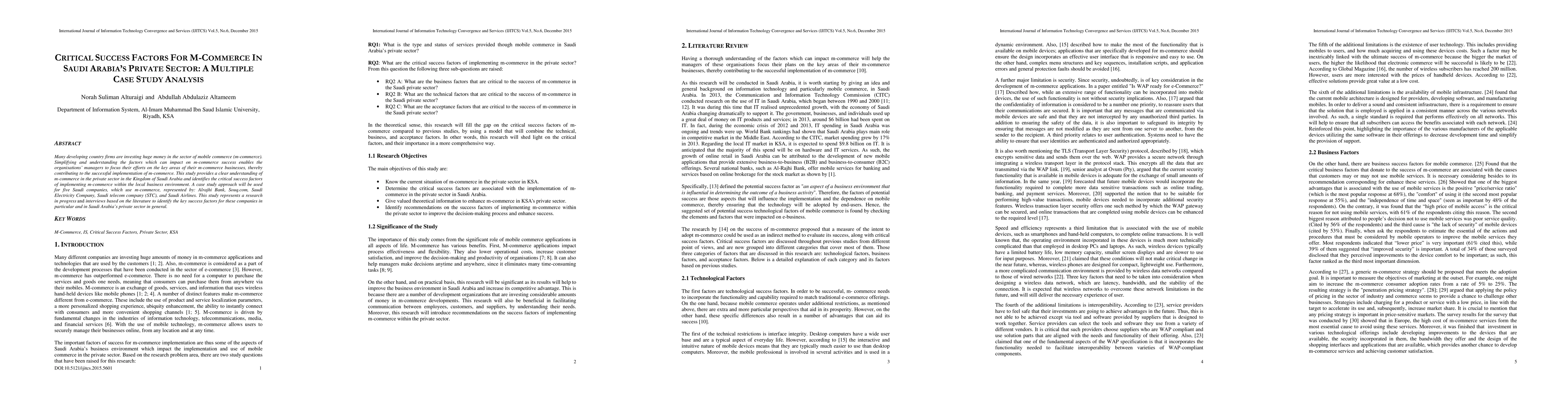 This study investigates the critical success factors for m-commerce implementation in Saudi Arabia's private sector through a multiple case study analysis of five companies. The research aims to identify key areas that contribute to m-commerce success, providing insights for local business managers.