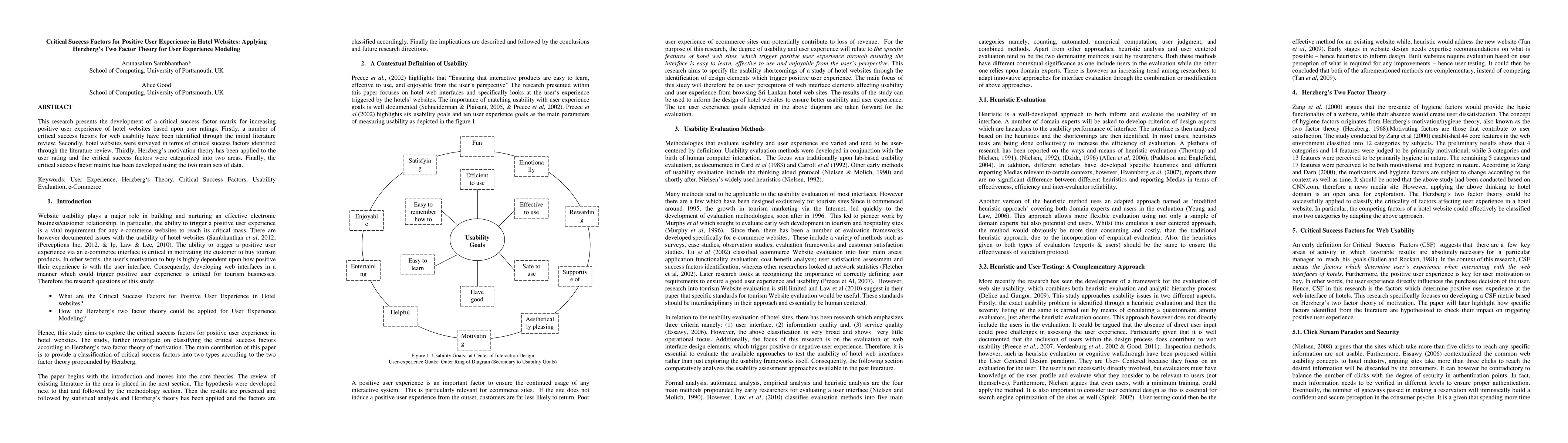 This study developed a critical success factor matrix to improve hotel website user experience, applying Herzberg's motivation theory to identify two main areas: hygiene factors (necessary for basic functionality) and motivators (desirable but not essential). The findings provide insights into the key factors that influence positive user experiences on hotel websites.