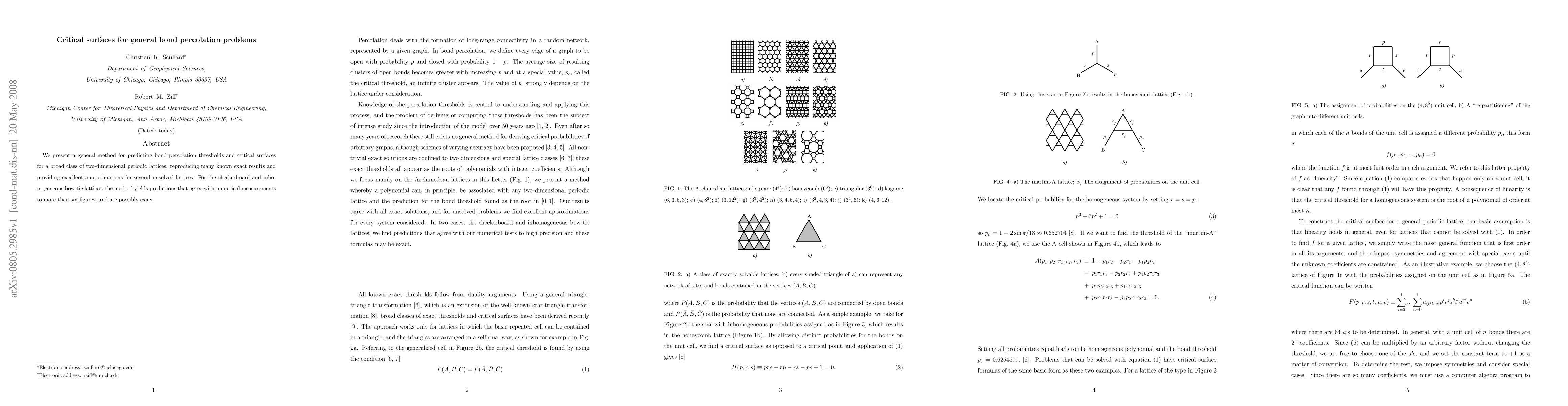 We present a general method for predicting bond percolation thresholds and critical surfaces for a broad class of two-dimensional periodic lattices, reproducing many known exact results and providing excellent approximations for several unsolved lattices. For the checkerboard and inhomogeneous bow-tie lattices, the method yields predictions that agree with numerical measurements to more than six figures, and are possibly exact.