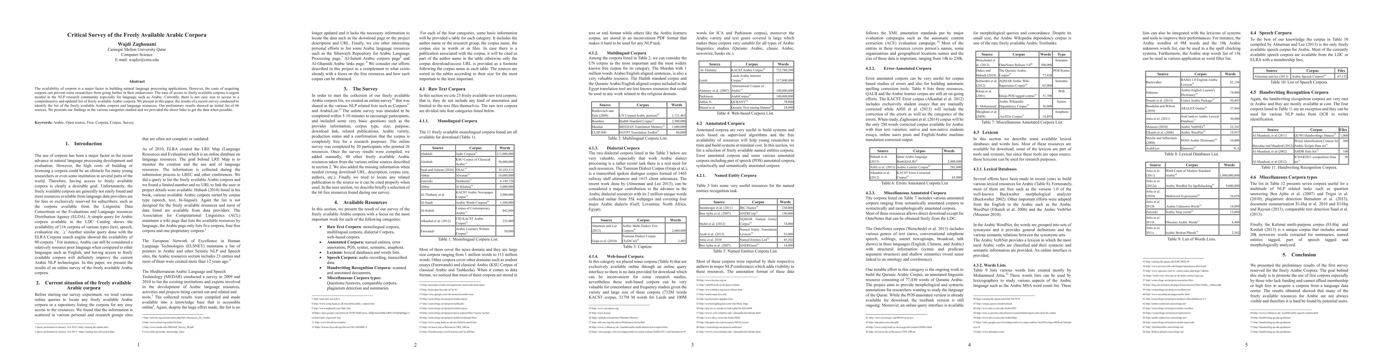 The availability of corpora is a major factor in building natural language processing applications. However, the costs of acquiring corpora can prevent some researchers from going further in their endeavours. The ease of access to freely available corpora is urgent needed in the NLP research community especially for language such as Arabic. Currently, there is not easy was to access to a comprehensive and updated list of freely available Arabic corpora. We present in this paper, the results of a recent survey conducted to identify the list of the freely available Arabic corpora and language resources. Our preliminary results showed an initial list of 66 sources. We presents our findings in the various categories studied and we provided the direct links to get the data when possible.