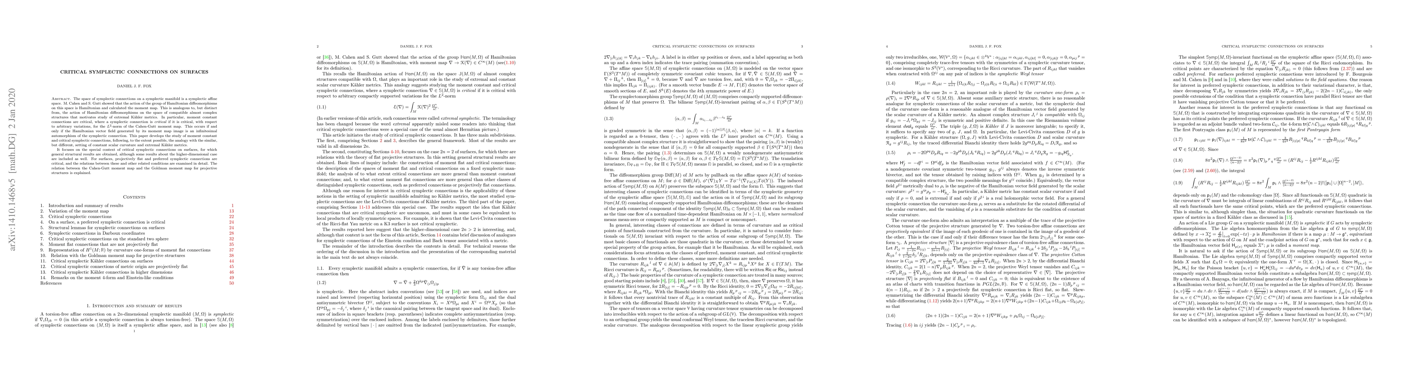 This paper investigates critical symplectic connections on surfaces, establishing that projectively flat and preferred symplectic connections are critical. It develops structural results by comparing the Cahen-Gutt moment map with the Goldman moment map for projective structures, revealing their interconnections.