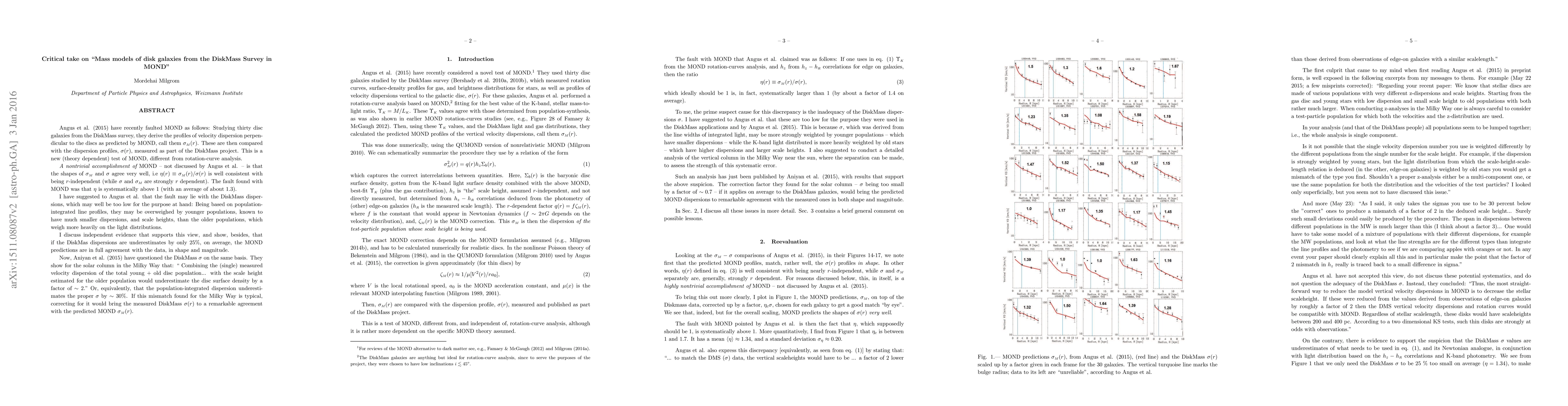 This paper critiques Angus et al.'s (2015) findings that Modified Newtonian Dynamics (MOND) fails to predict velocity dispersion profiles in disk galaxies. The author argues that the fault may lie in the DiskMass survey's dispersion measurements, which could be underestimated due to younger populations' influence, and suggests a 25% correction aligns MOND predictions with observed data.