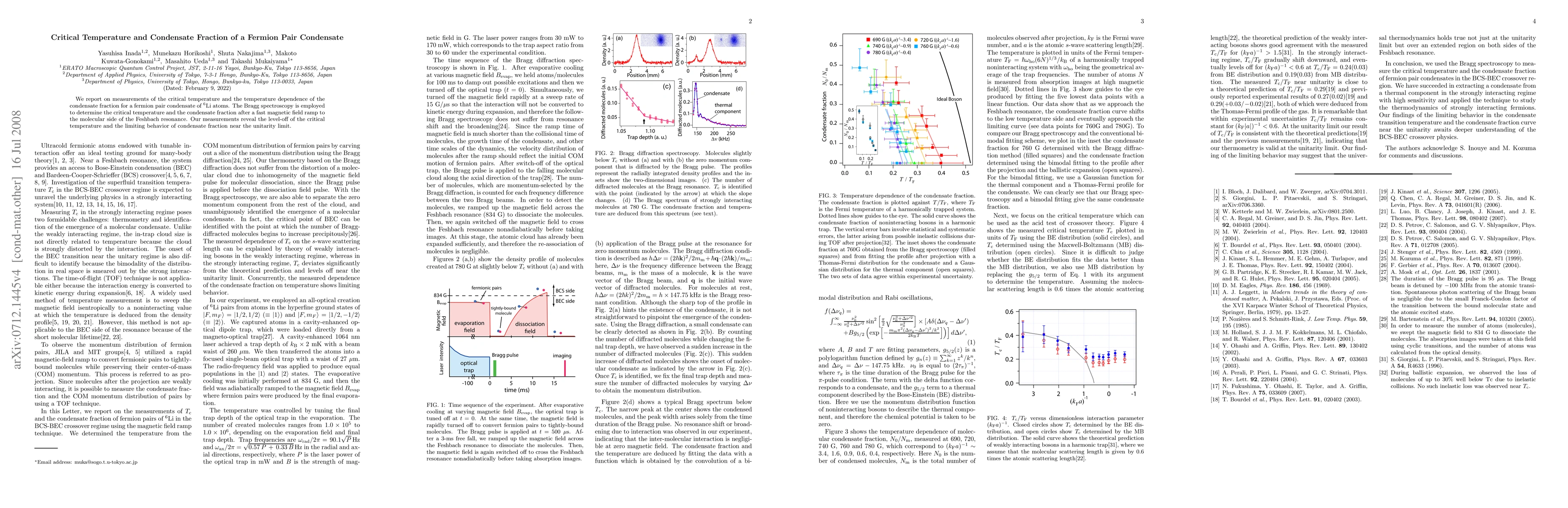This study measures the critical temperature and condensate fraction for a fermion pair condensate of 6Li atoms using Bragg spectroscopy. The research reveals a plateau in the critical temperature and a limiting behavior of the condensate fraction near the unitarity limit.