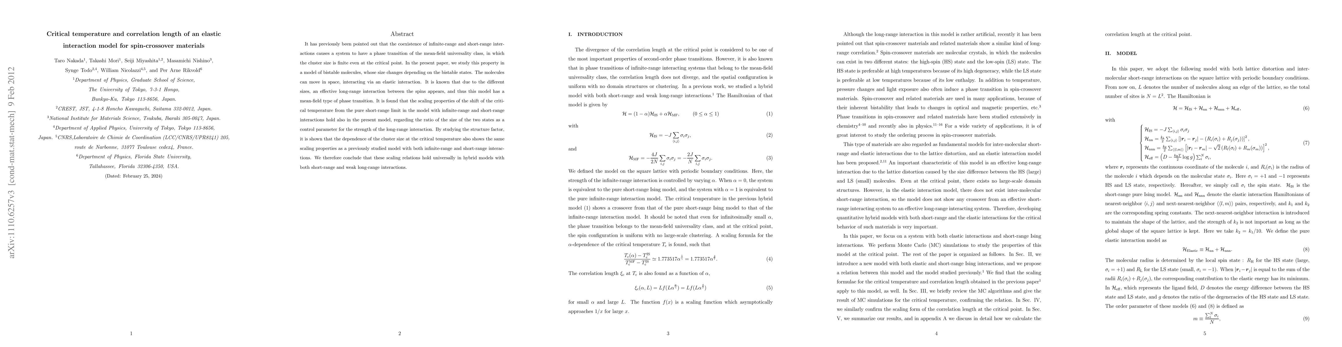 Researchers studied a model of spin-crossover materials with both short-range and long-range interactions, finding that scaling properties related to critical temperature and cluster size hold universally in hybrid models.