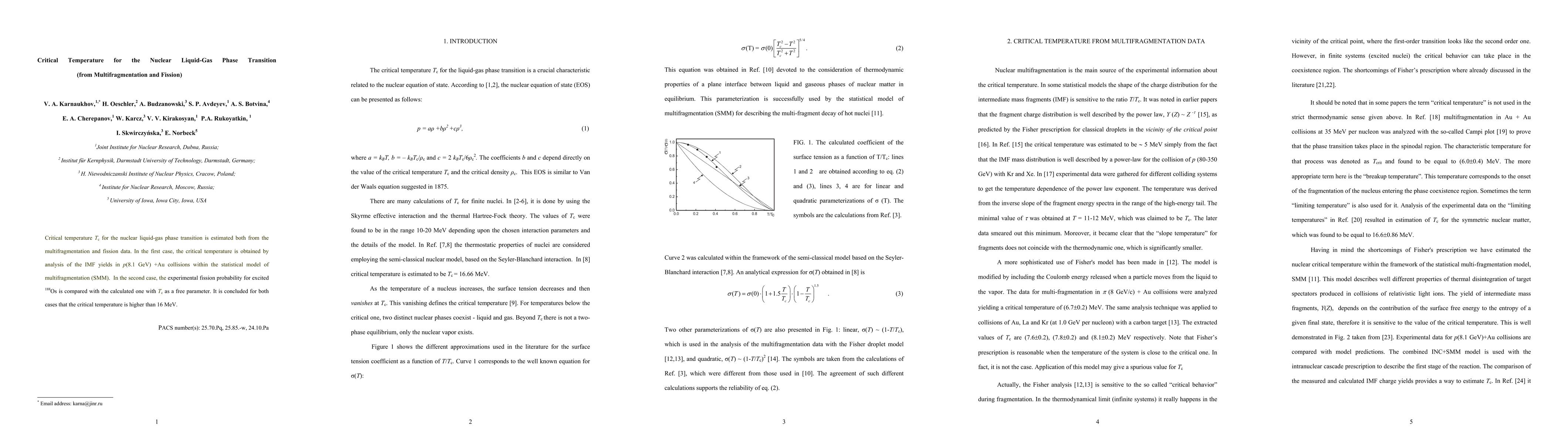 This paper estimates the critical temperature Tc for the nuclear liquid-gas phase transition, finding it to be higher than 16 MeV. The estimation is derived from multifragmentation analysis in p(8.1 GeV)+Au collisions and fission probability comparisons in excited 188Os.
