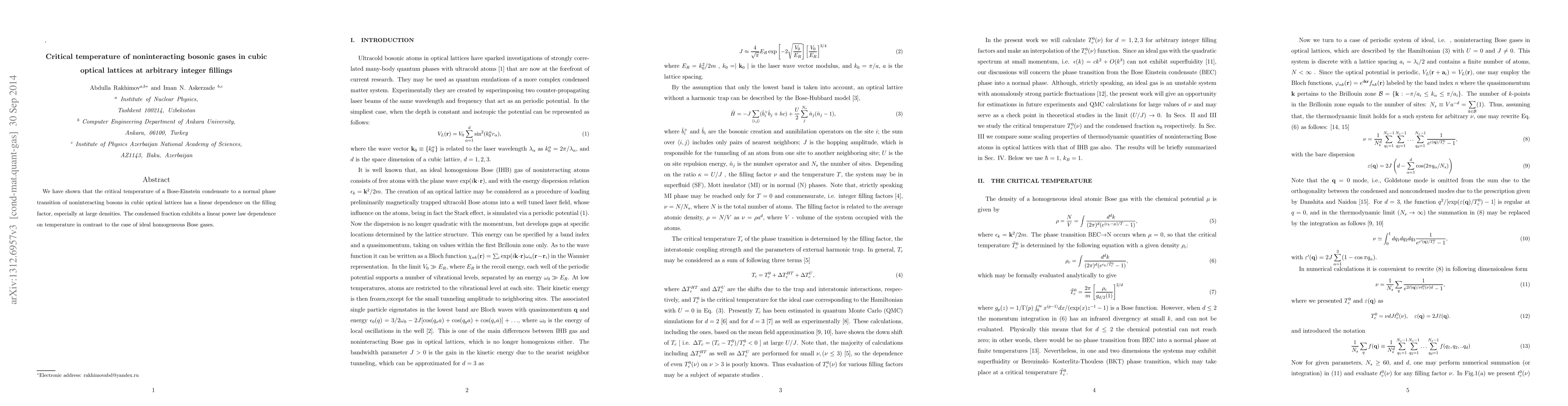 Summary: This study reveals that the critical temperature for a phase transition in noninteracting bosonic gases within cubic optical lattices linearly depends on the filling factor, especially at high densities. Unlike ideal homogeneous Bose gases, the condensed fraction here follows a linear power law with temperature.